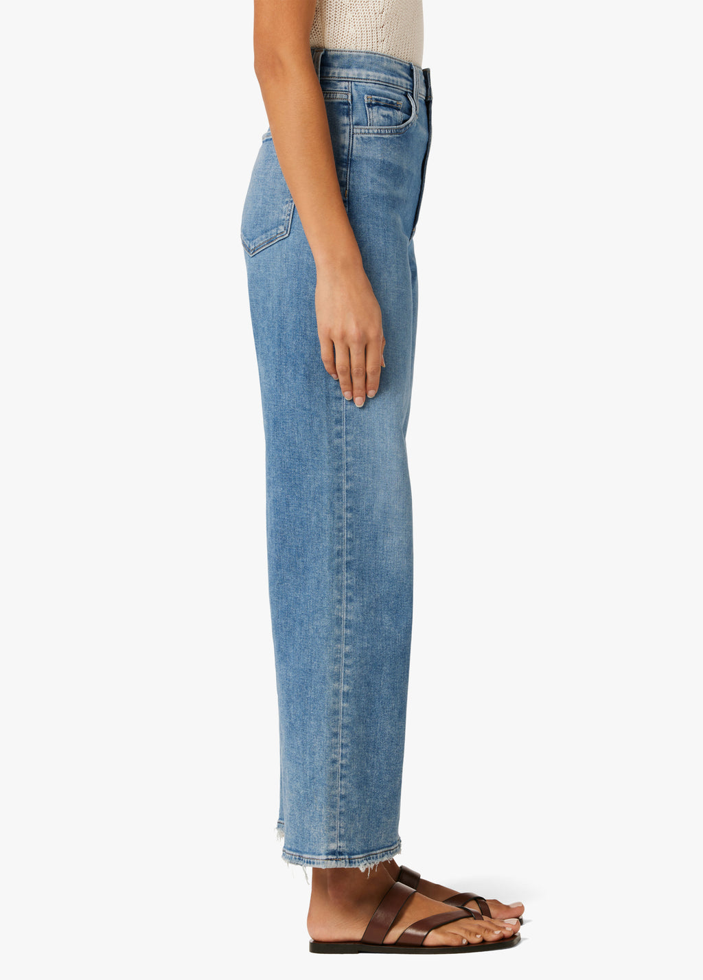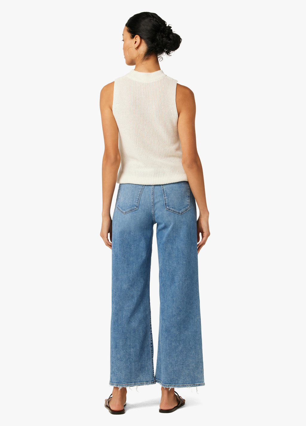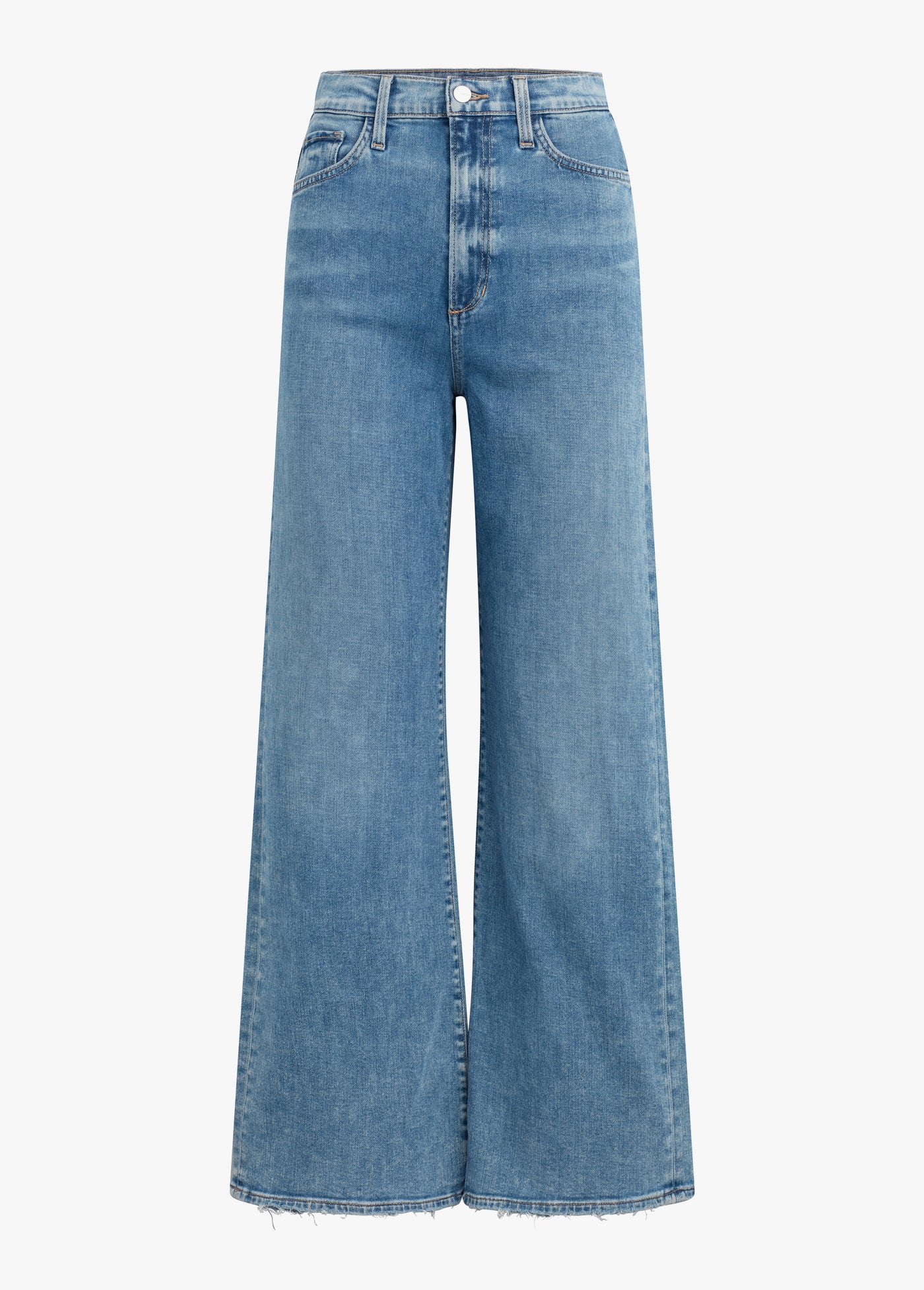 The high-rise, wide leg Mia jean in ‘Live It Up is a medim shade of denim with top whiskering and hand sanding. The razor hems give these showstoppers an unfinished edge.