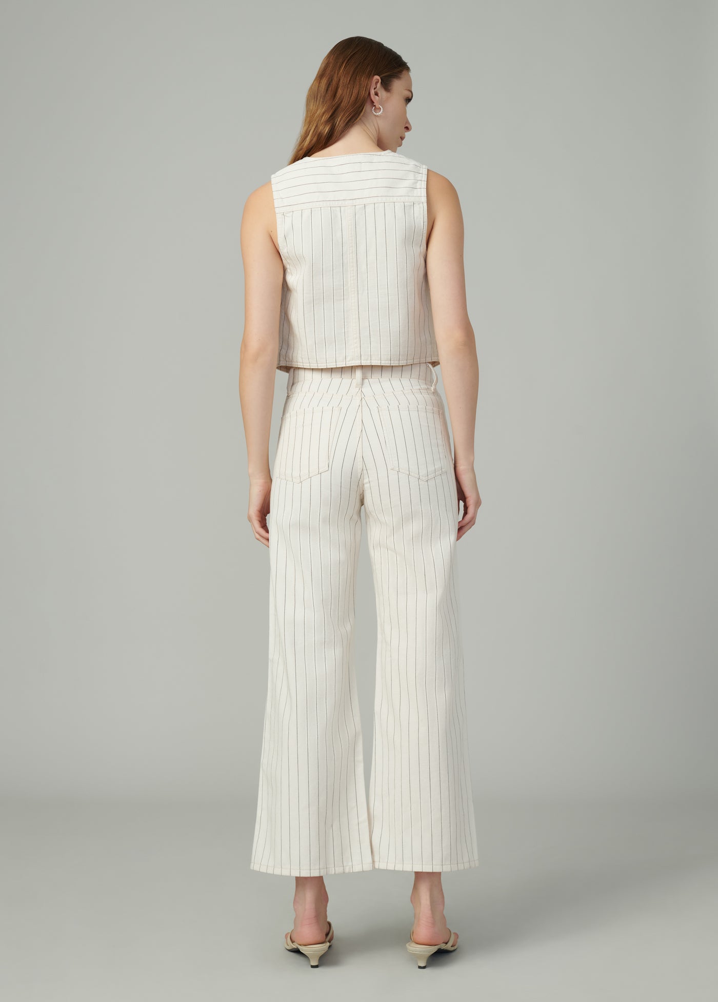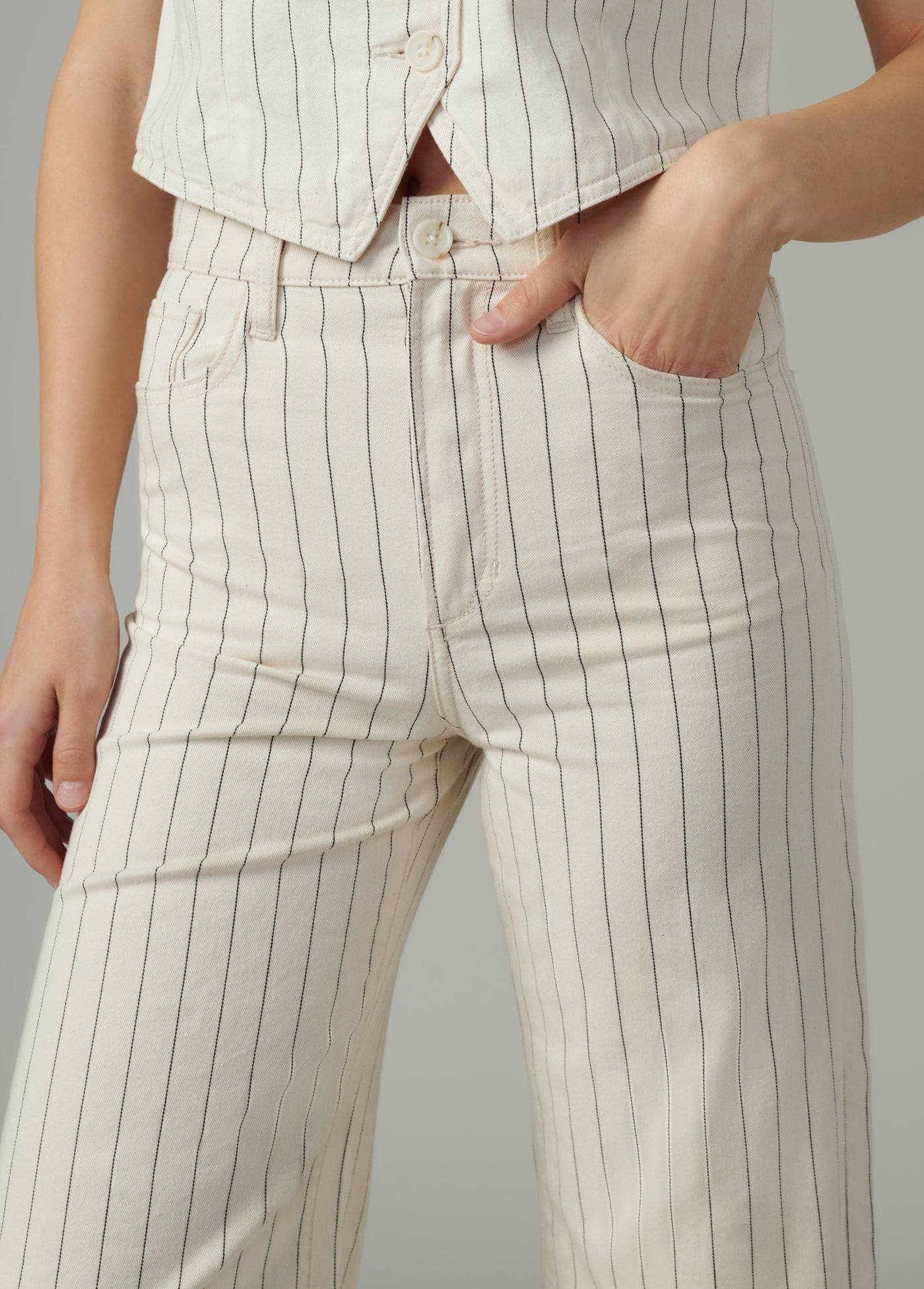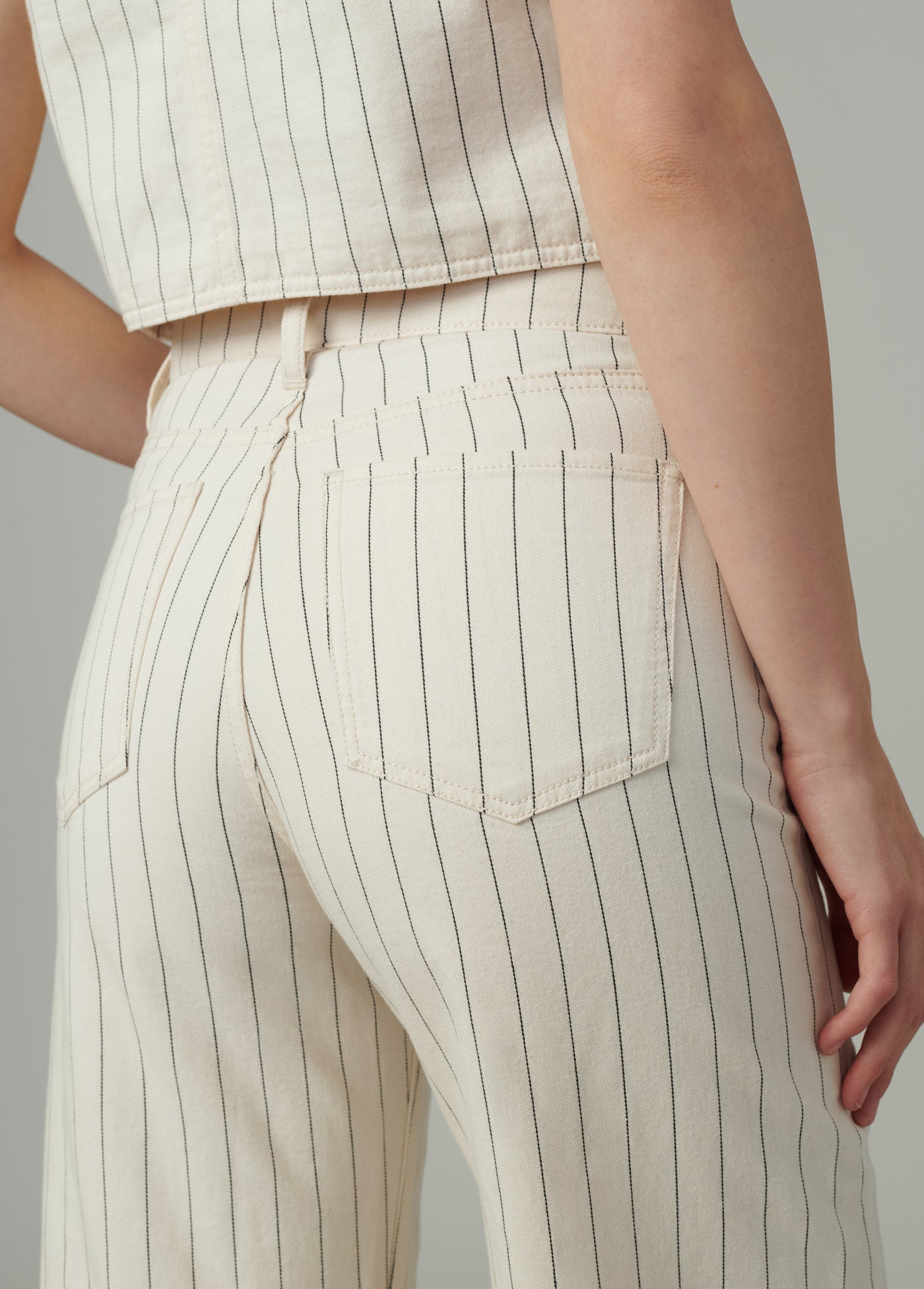 Lightweight, yarn-dyed natural and black pinstripe denim.