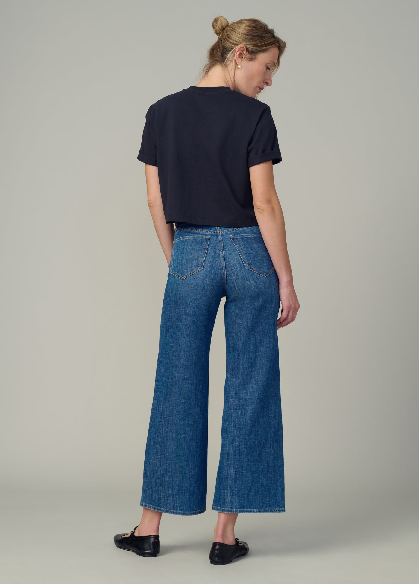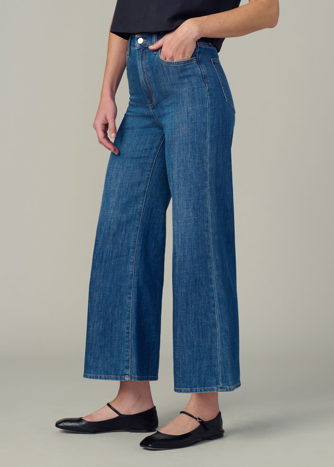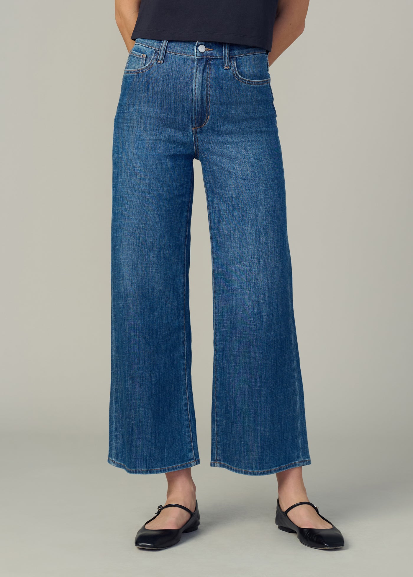 A high-rise wide leg ankle that is fitted through the waist and hip and falls to a wide leg that ends right at the ankle.