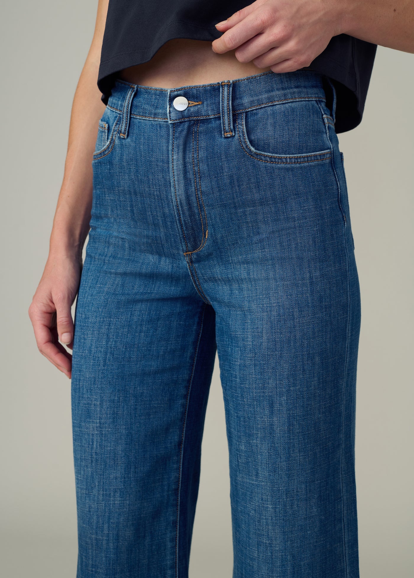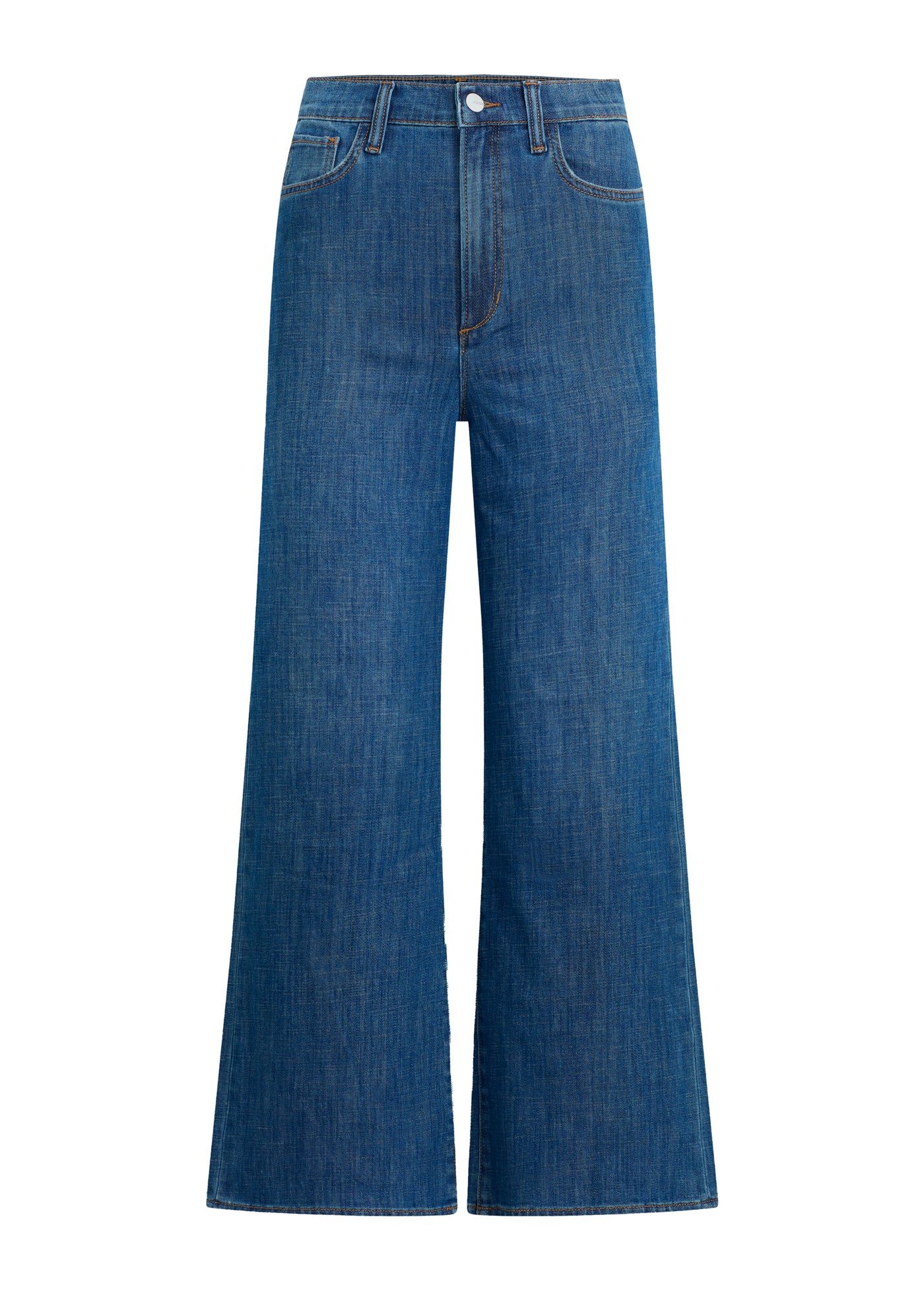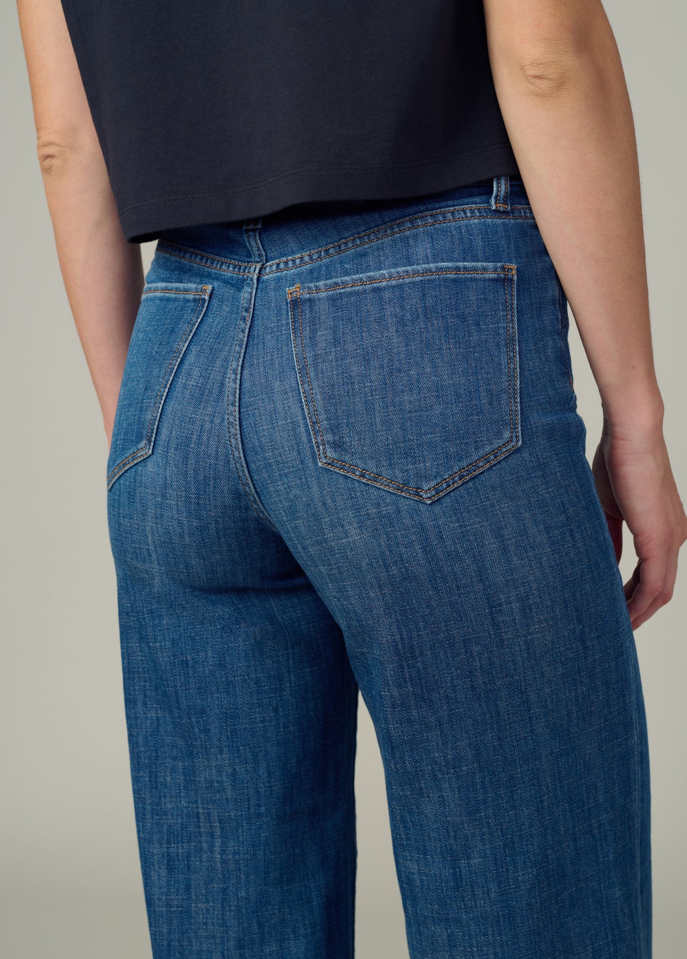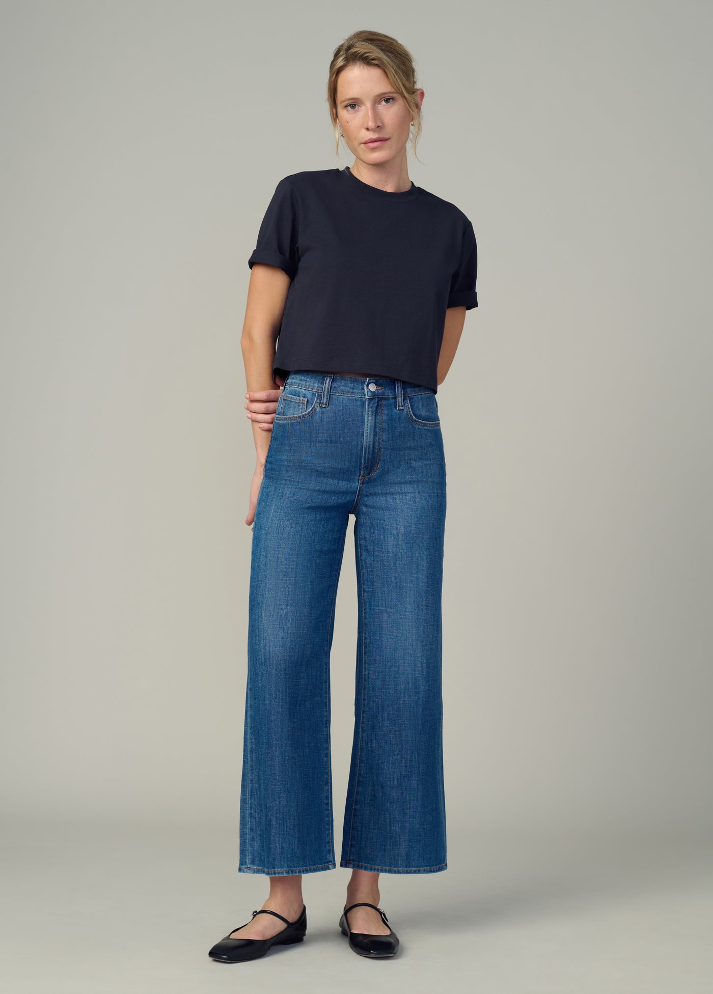 A high-rise wide leg ankle that is fitted through the waist and hip and falls to a wide leg that ends right at the ankle.