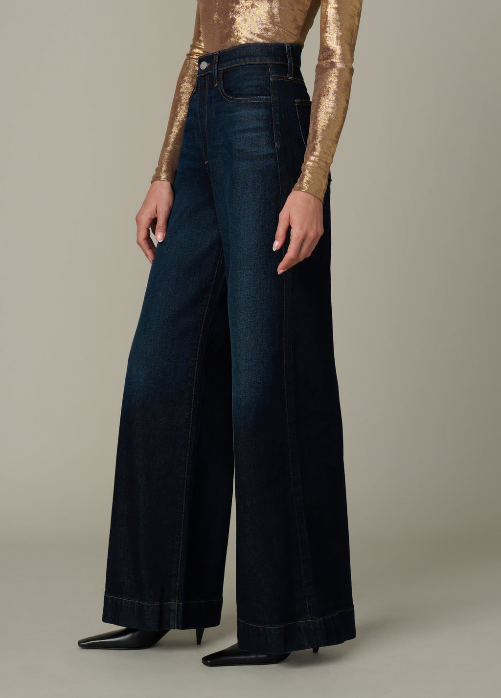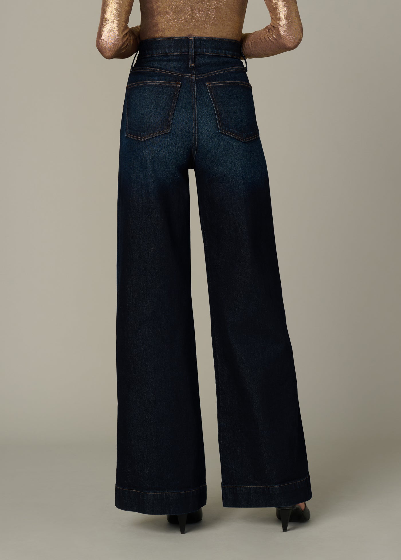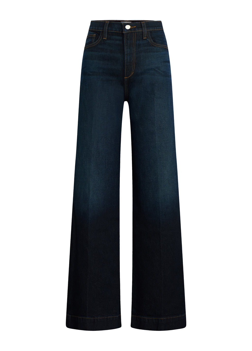 A high rise and slim fit through the waist and hip with a full-length wide leg.