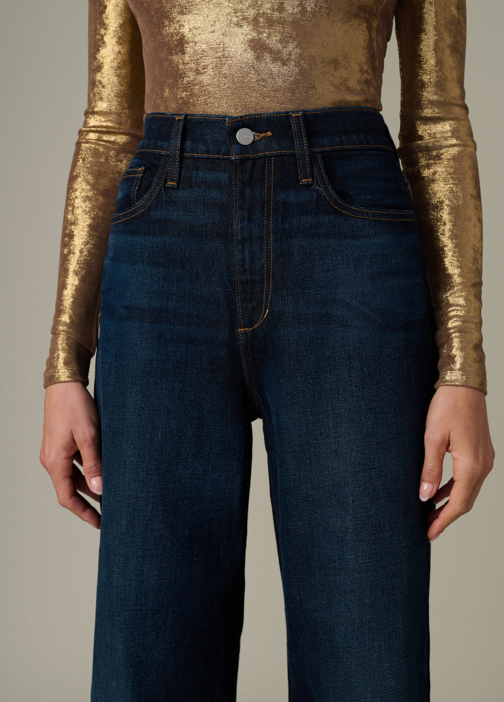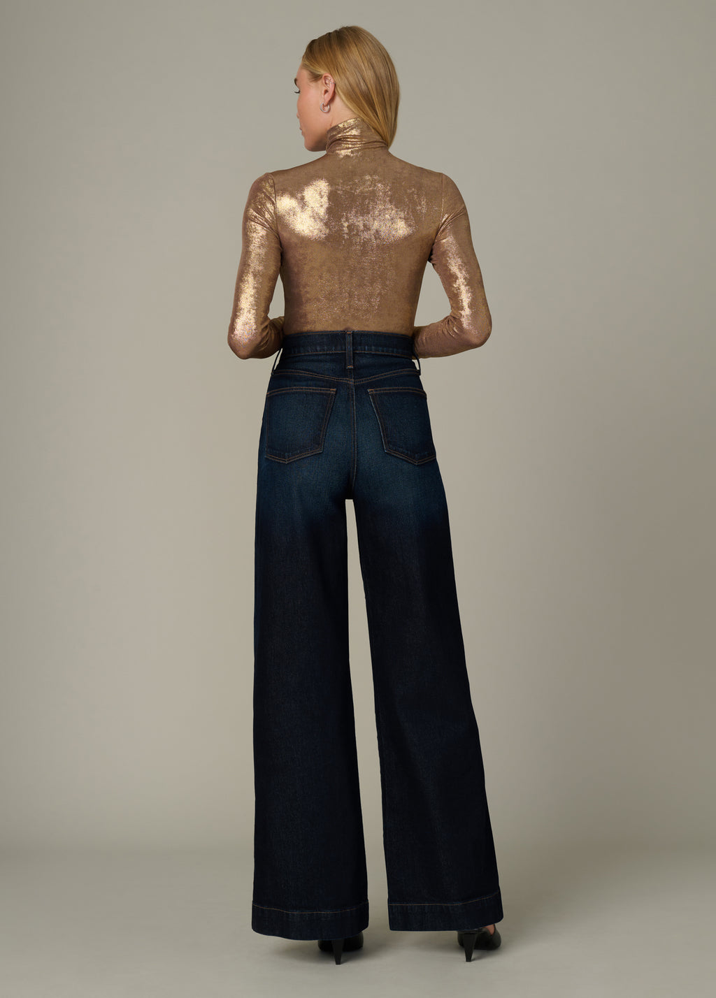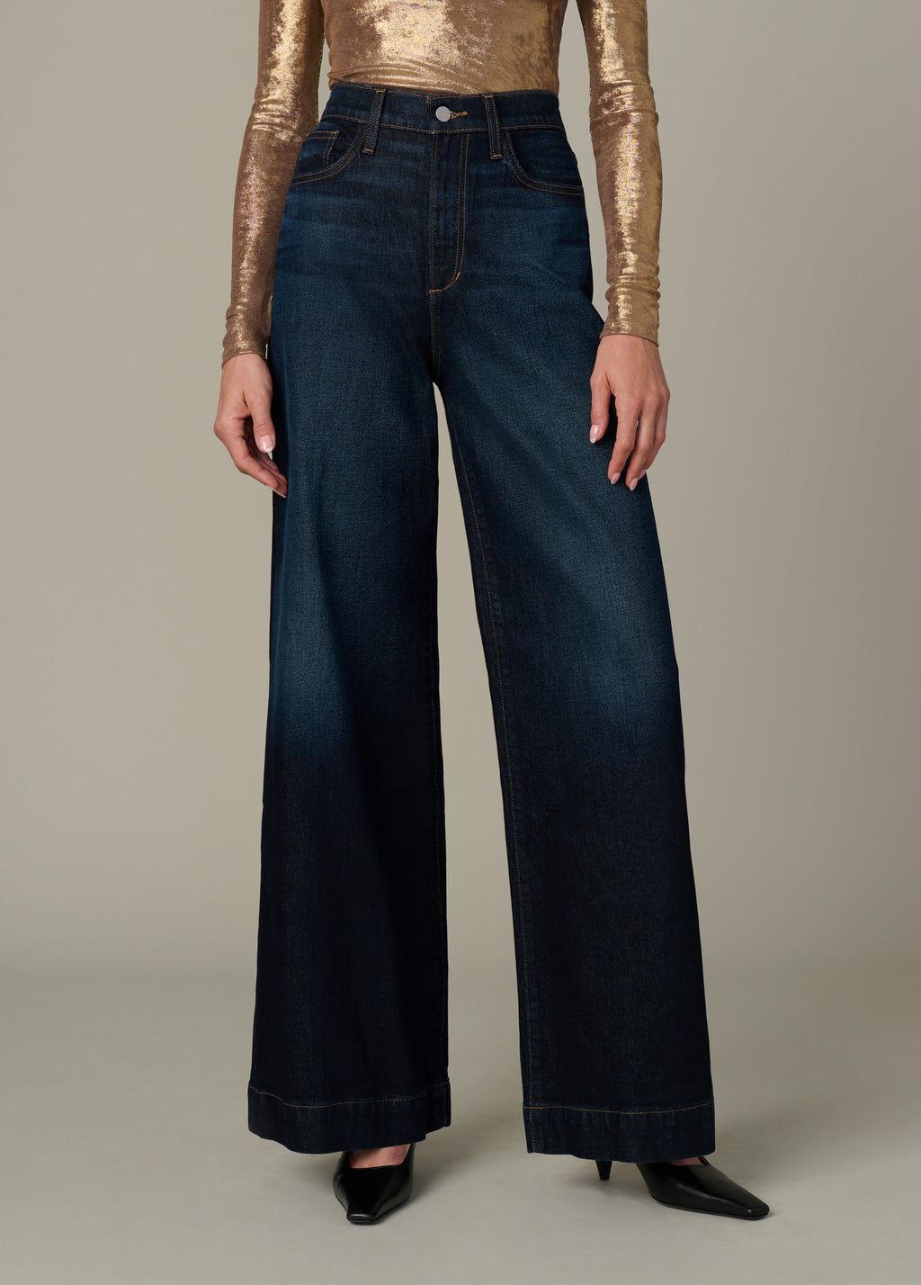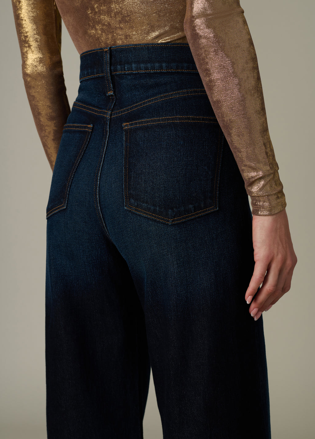 A high rise and slim fit through the waist and hip with a full-length wide leg.