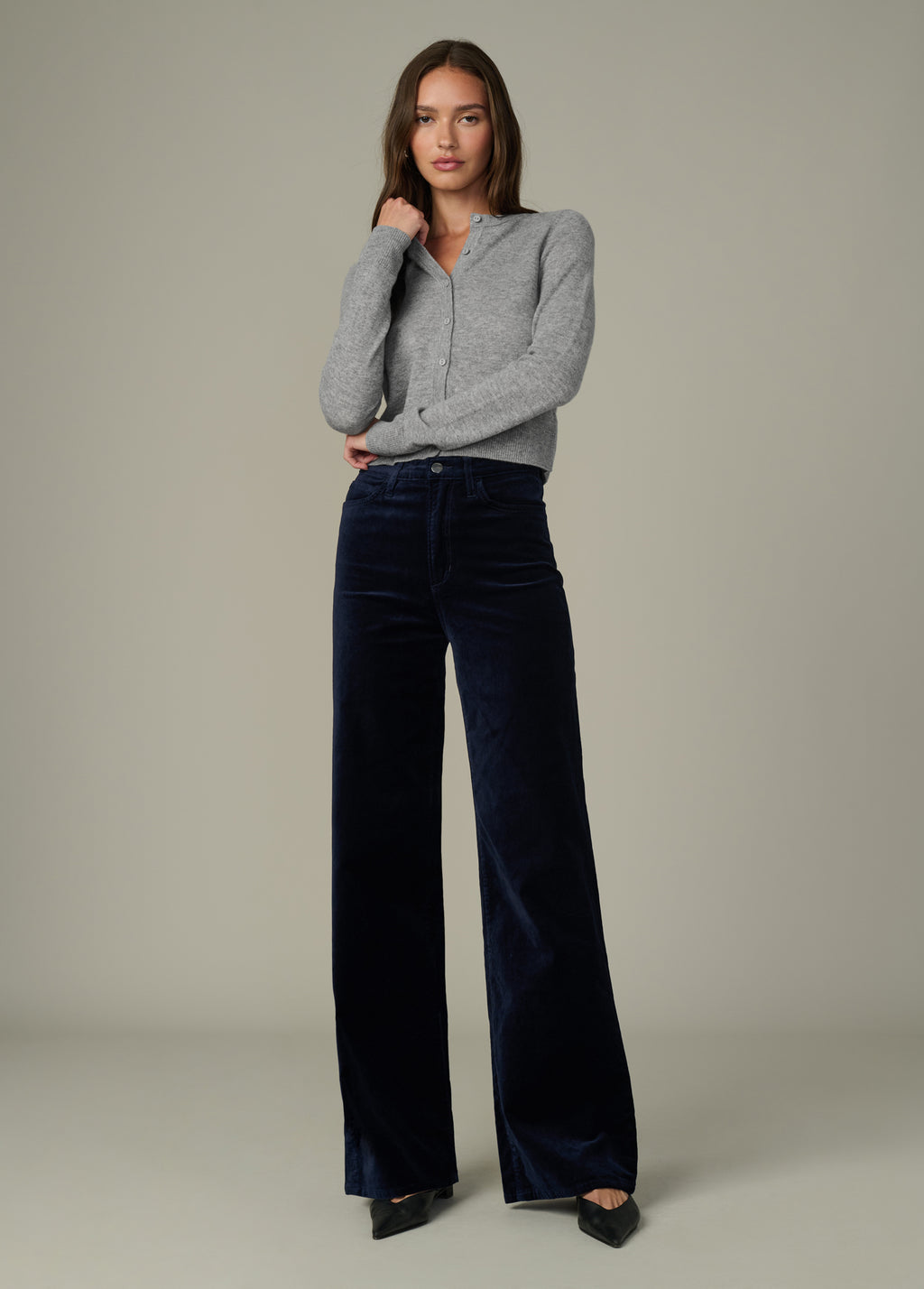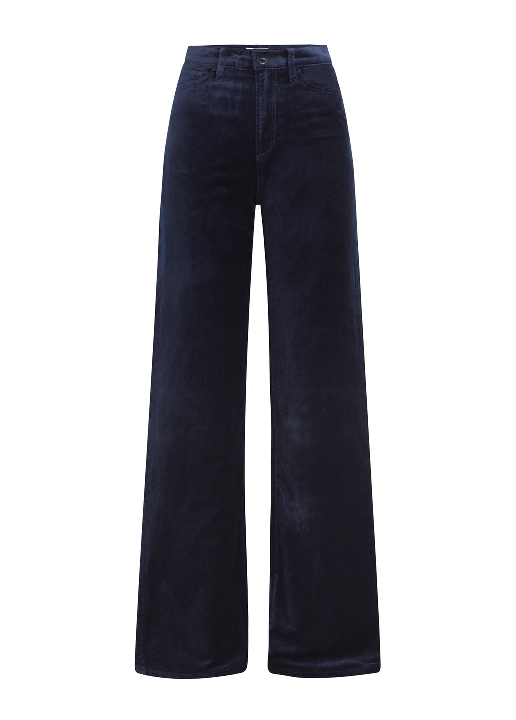 A high rise and slim fit through the waist and hip with a full-length wide leg.