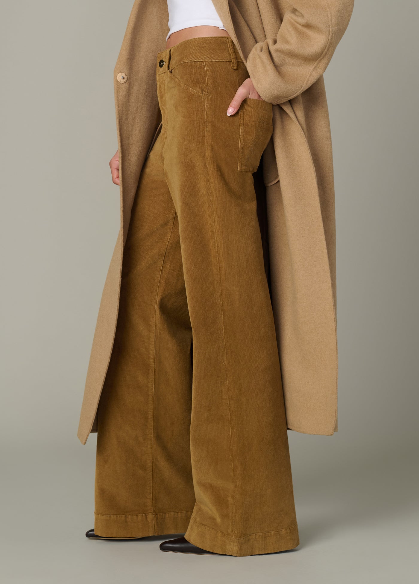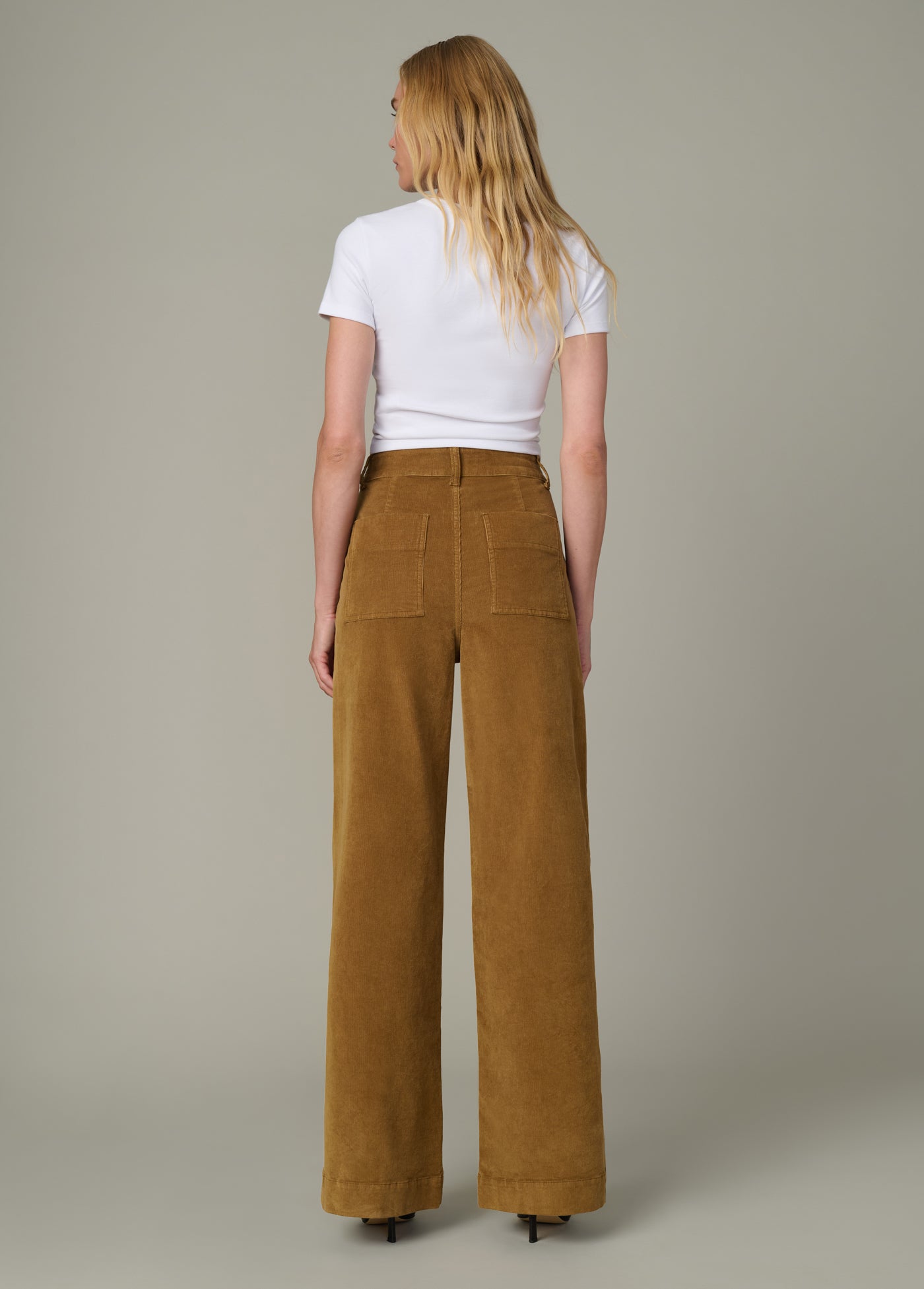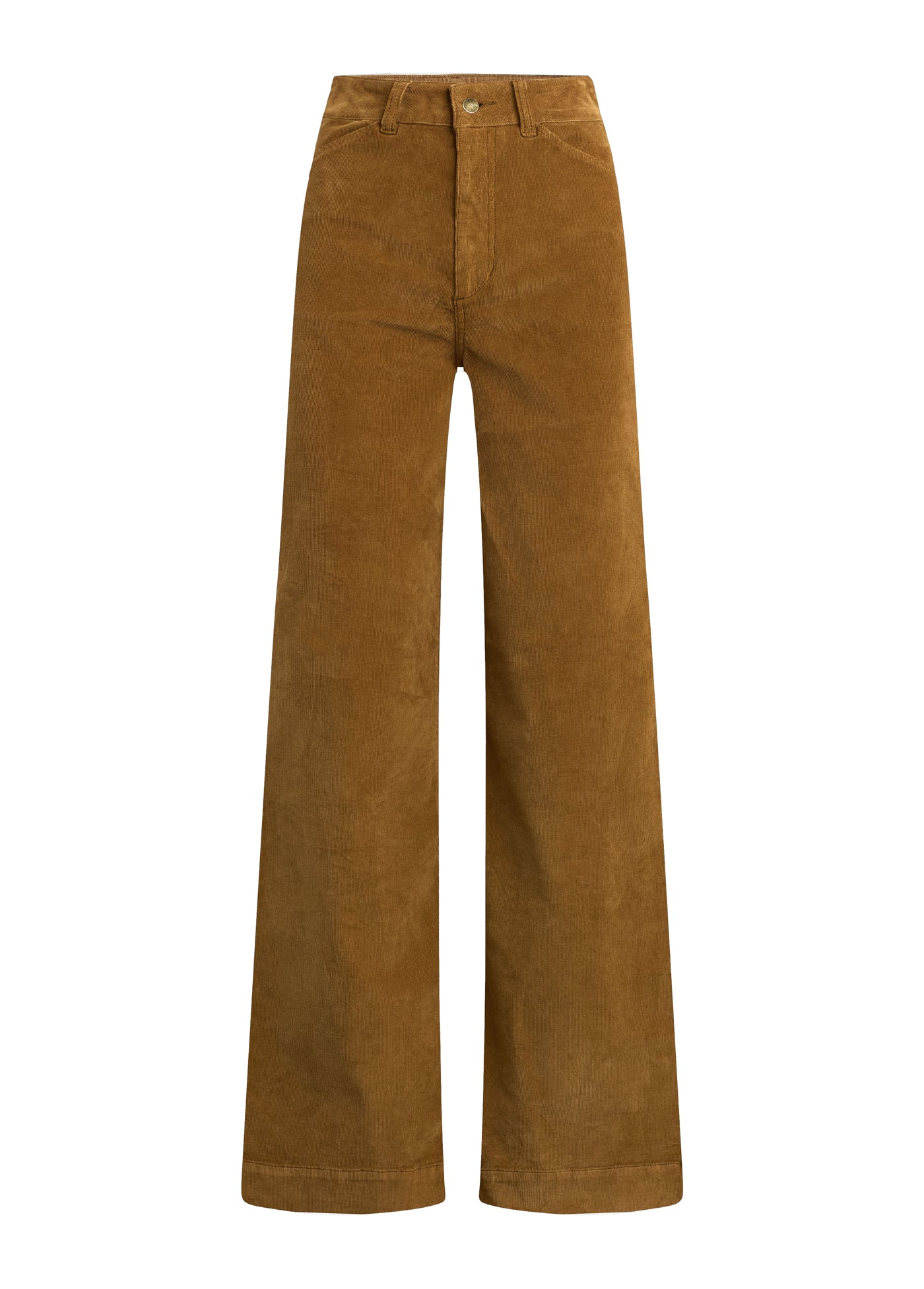 A high rise and slim fit through the waist and hip with a full-length wide leg.