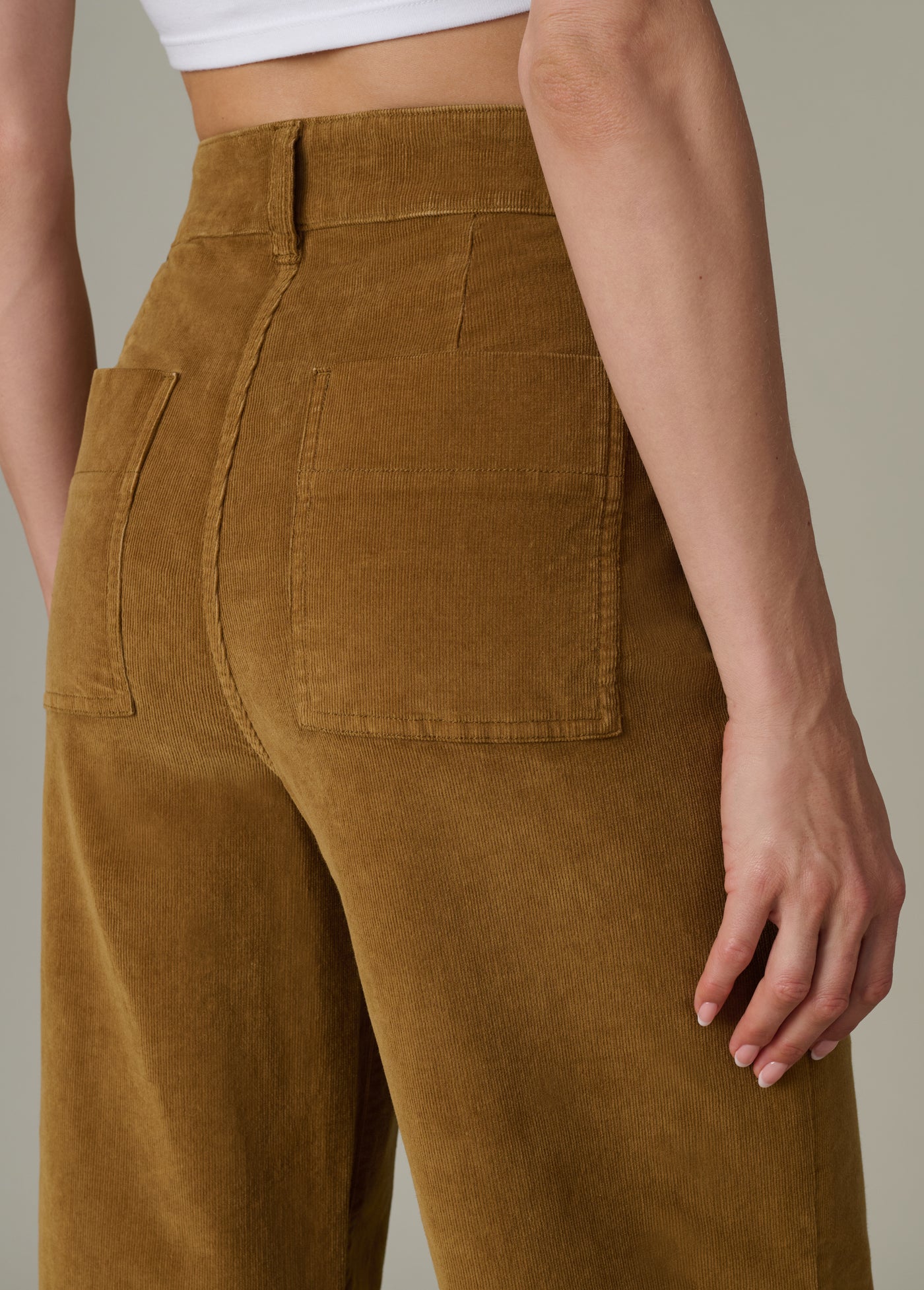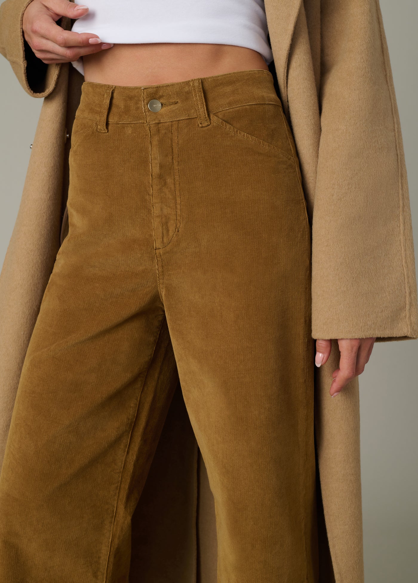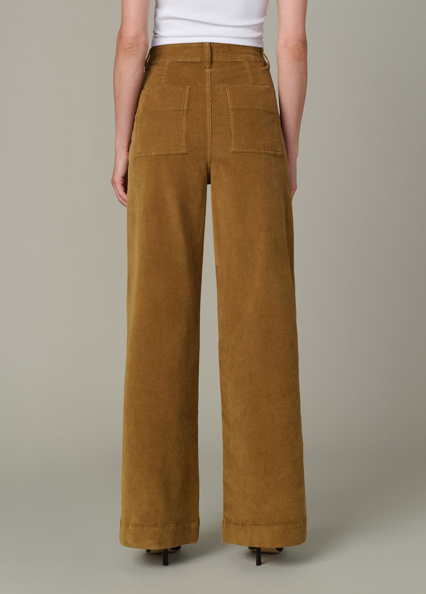 A high rise and slim fit through the waist and hip with a full-length wide leg.