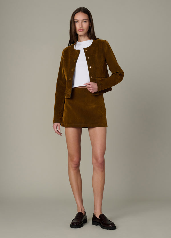 Comfort stretch denim with all-over flocked pile for a velvet look and feel.