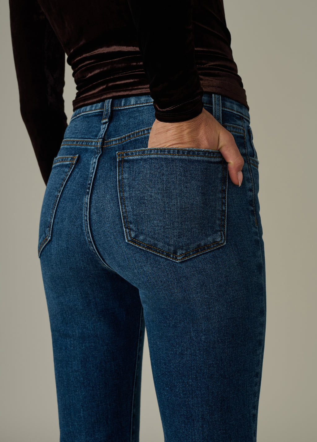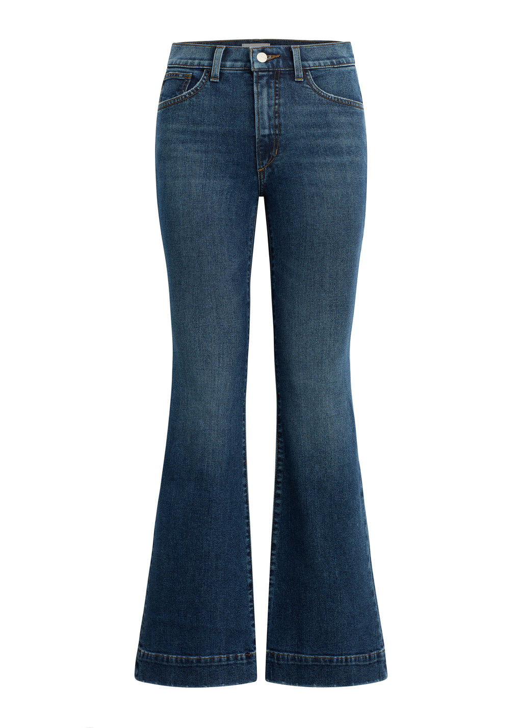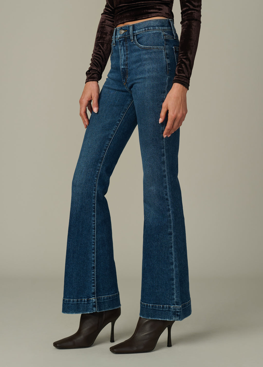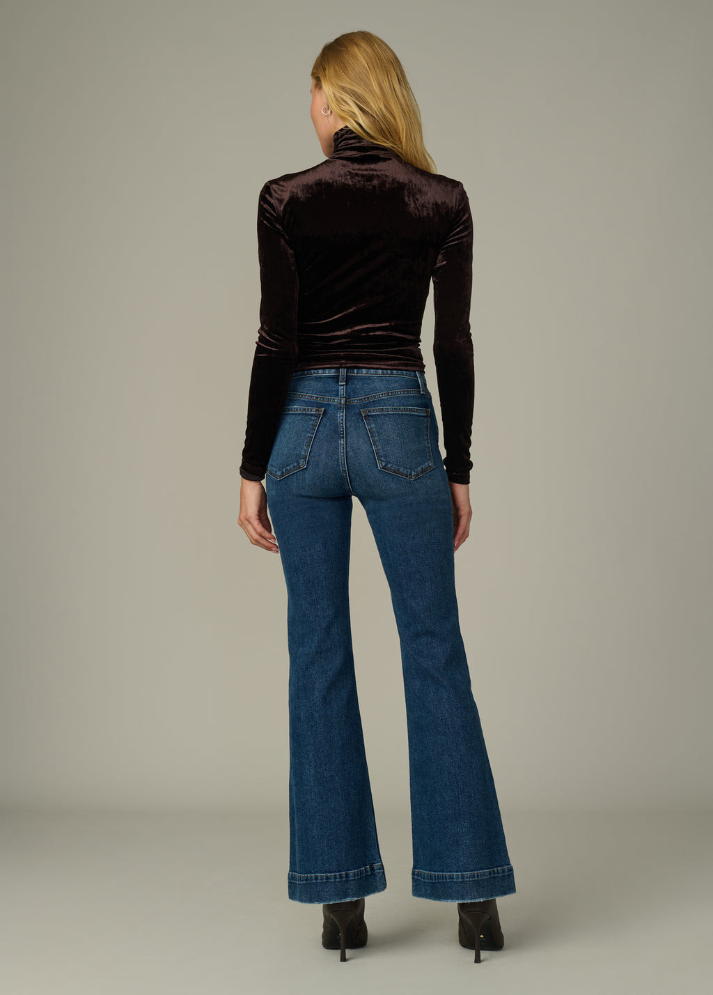 A high rise and slim fit through the waist and hip with a relaxed knee that breaks to a wide flare.