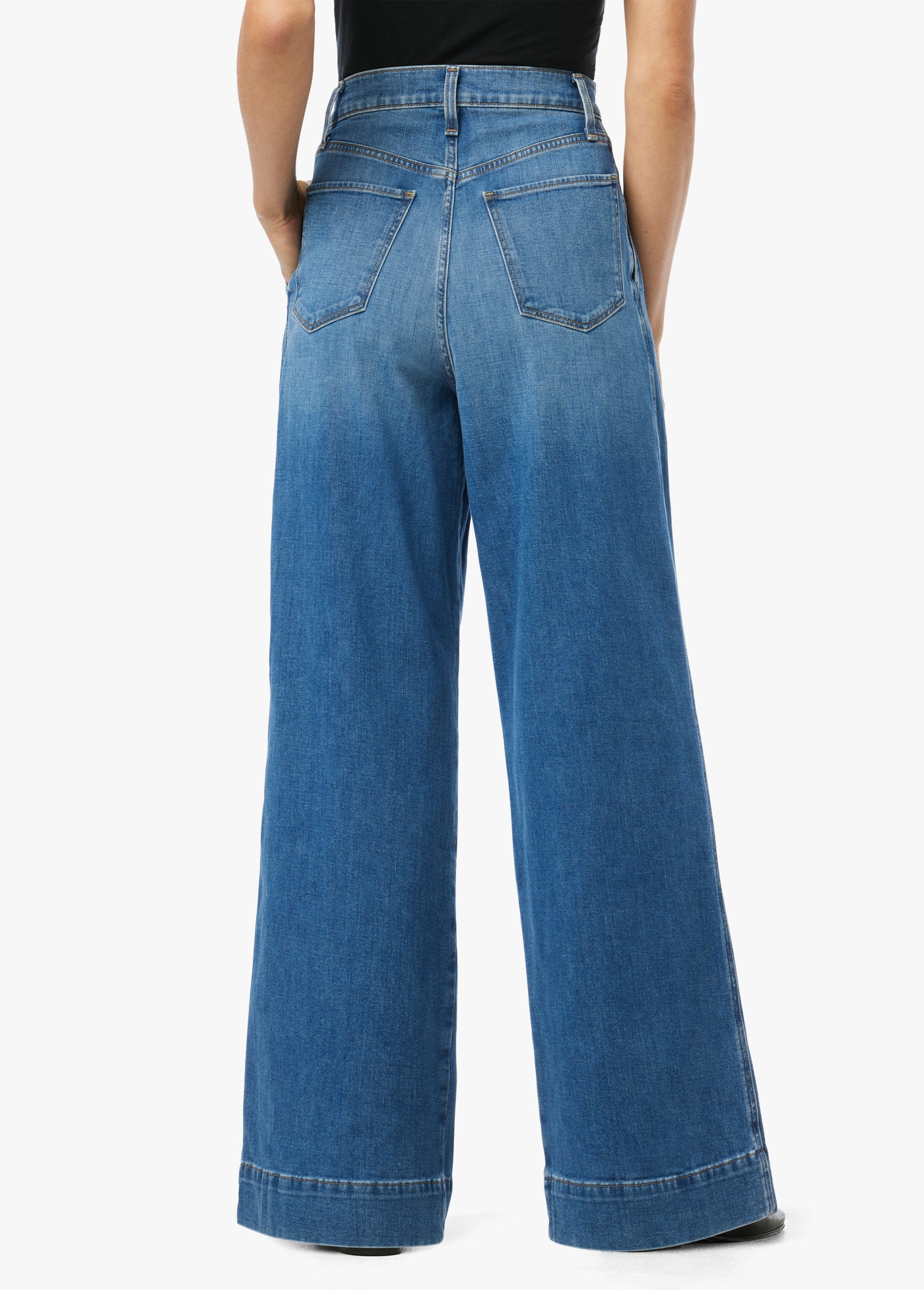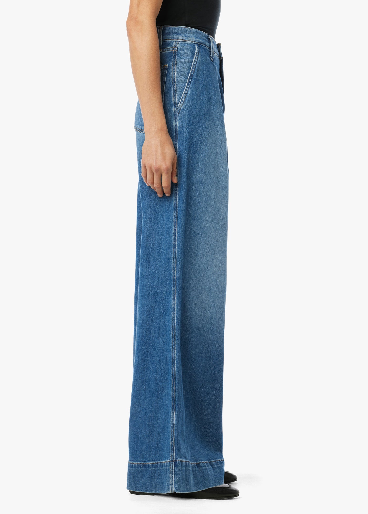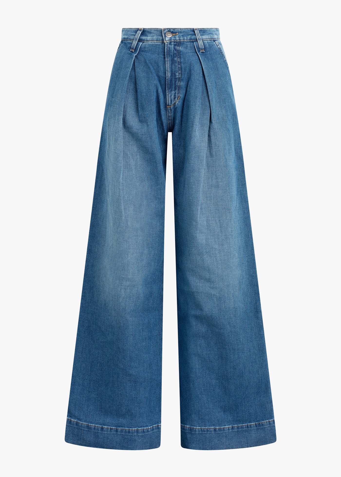 Elevate your casual style with the new Pleated Denim Trouser that seamlessly combines comfort and sophistication. Sitting high on the waist, the denim is cinched then falls to an easy leg. Overlappig pleats at the waist, slant pockets and wide hems finish the look. Done in a timeless blue twill, Awake, this pair can take your from work to weekend.