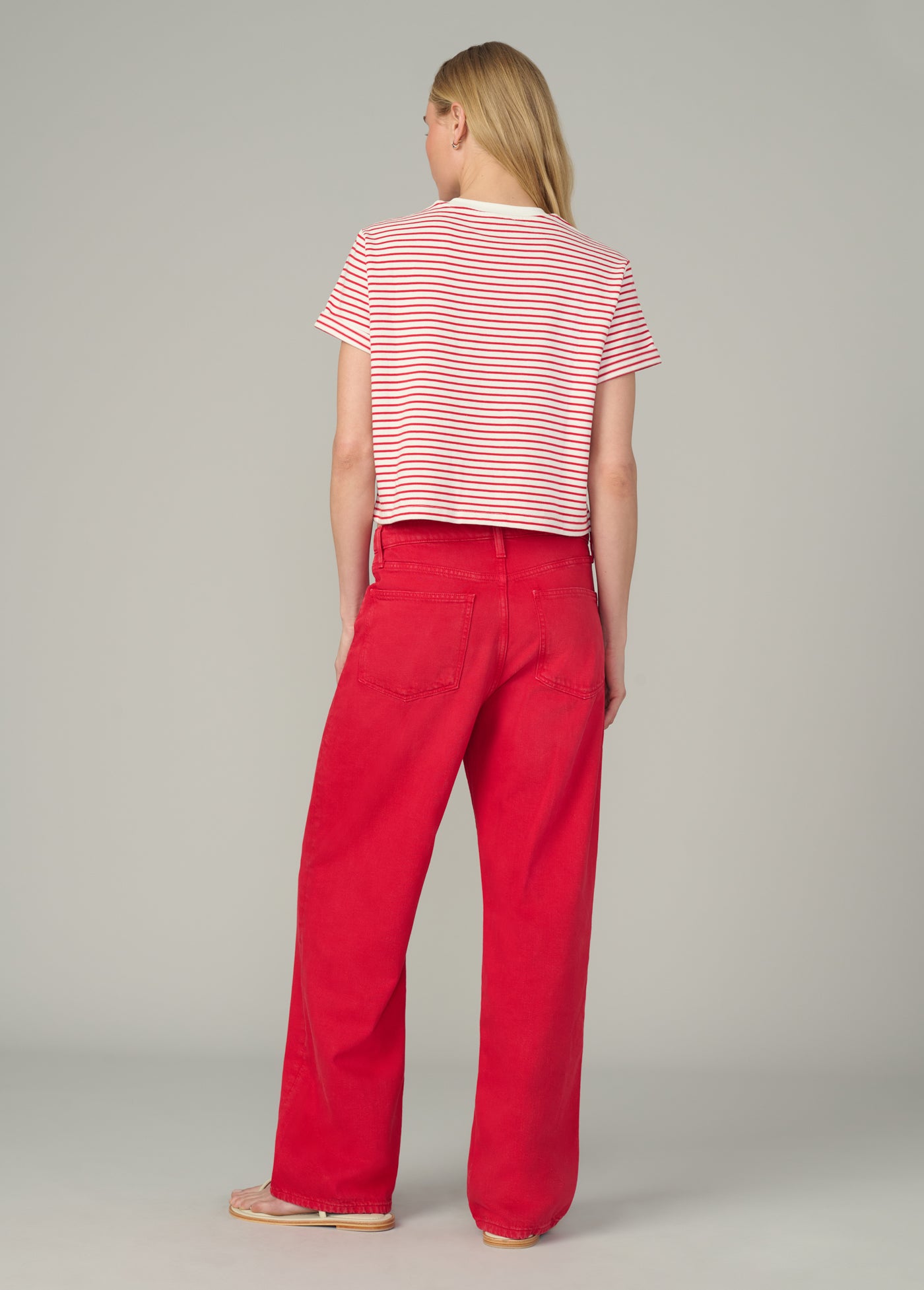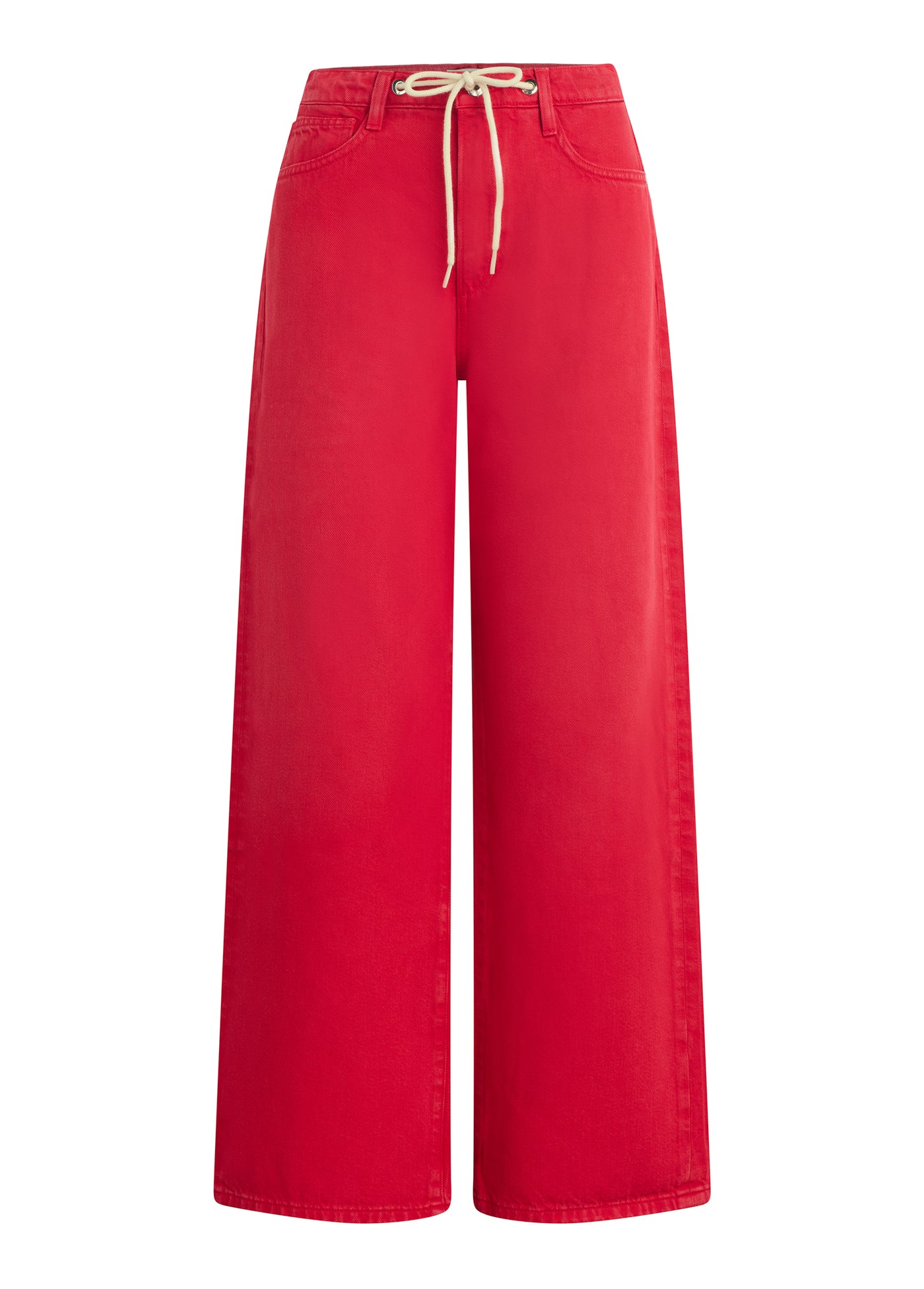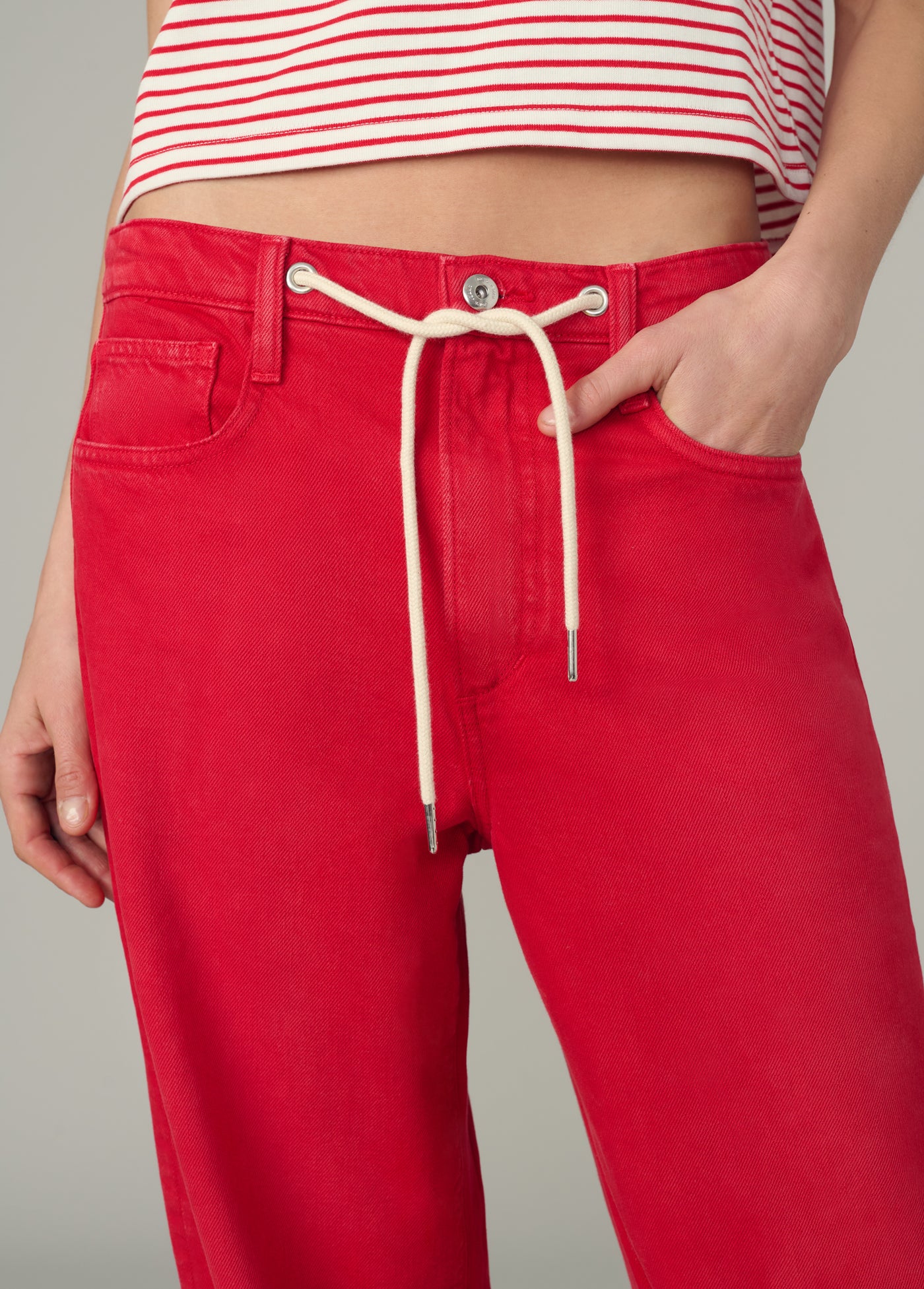 An oversized, relaxed fit that sits on the hip with a full-length inseam that pools over the foot.