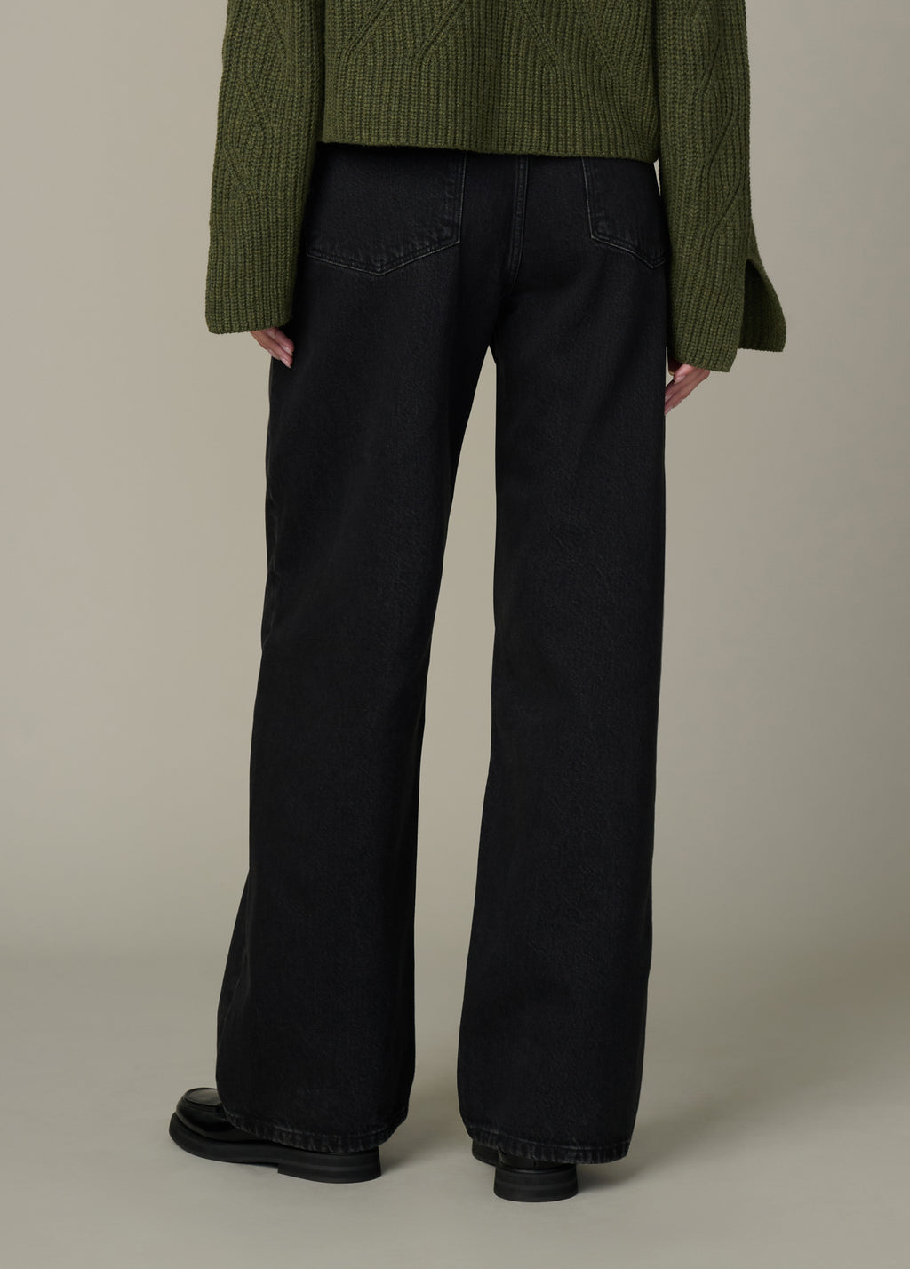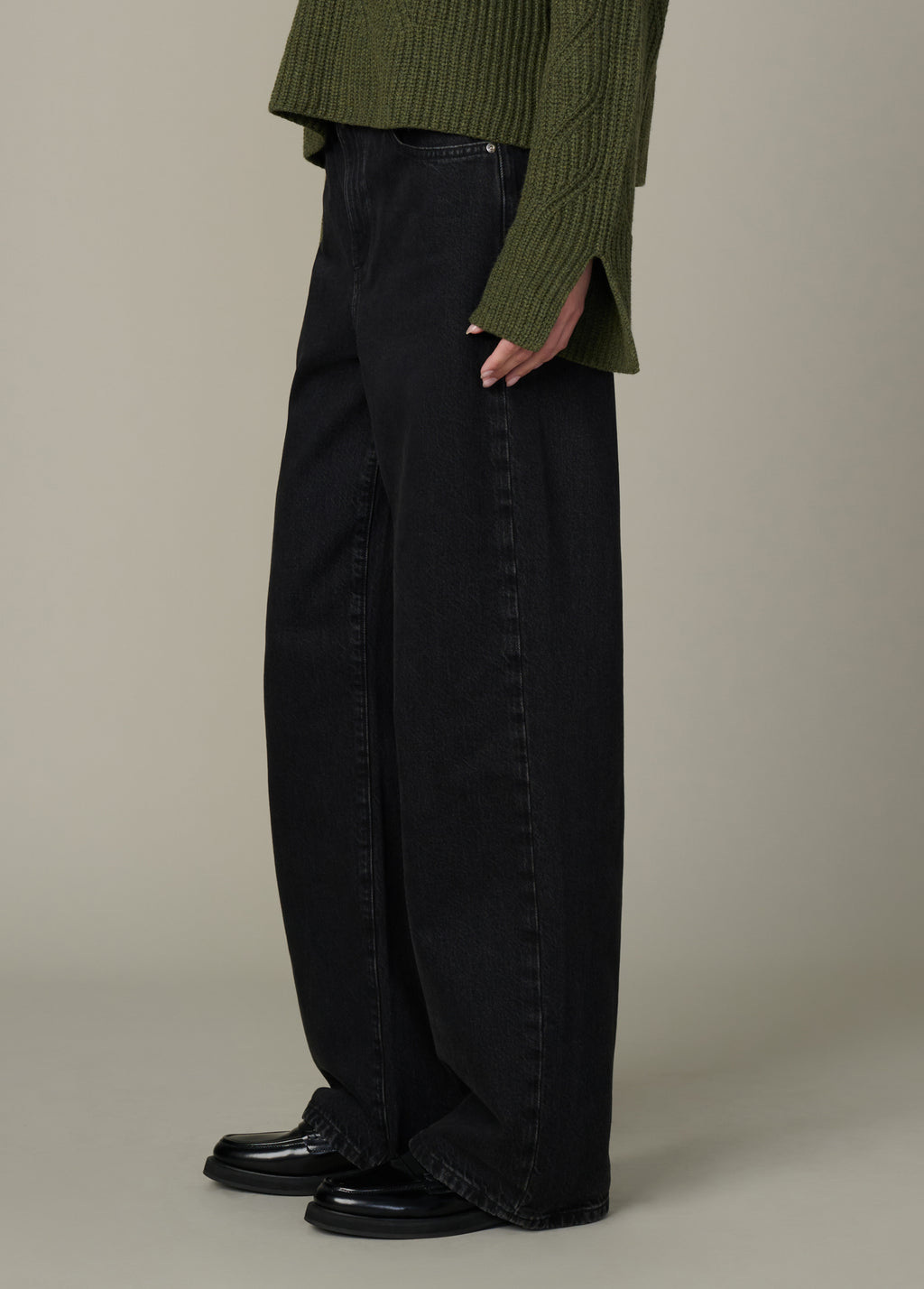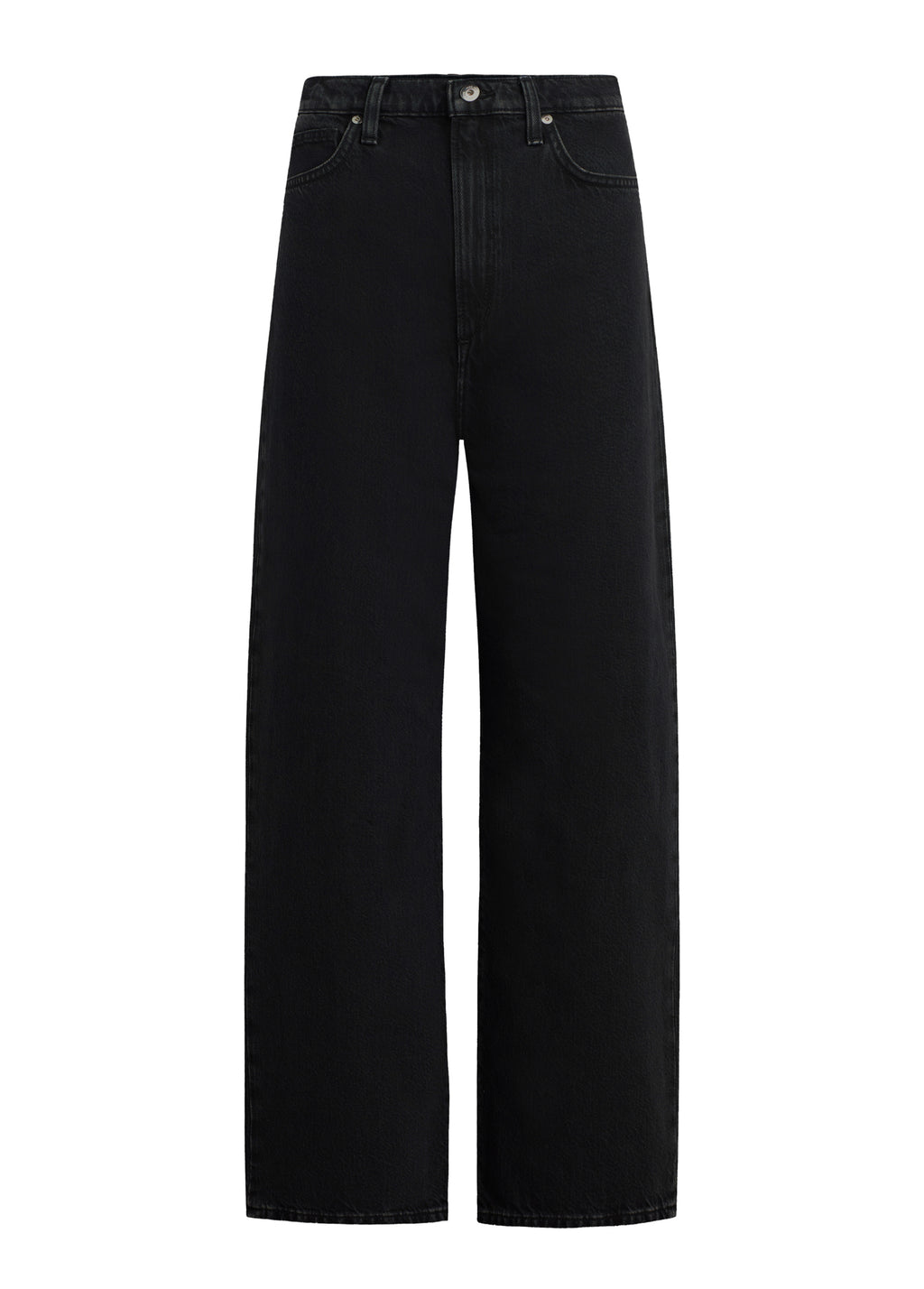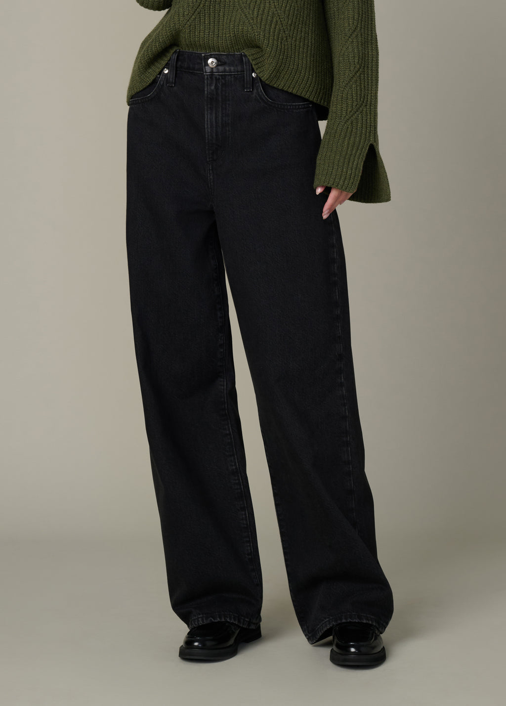 An oversized, relaxed fit that sits on the hip with a full-length inseam that pools over the foot.