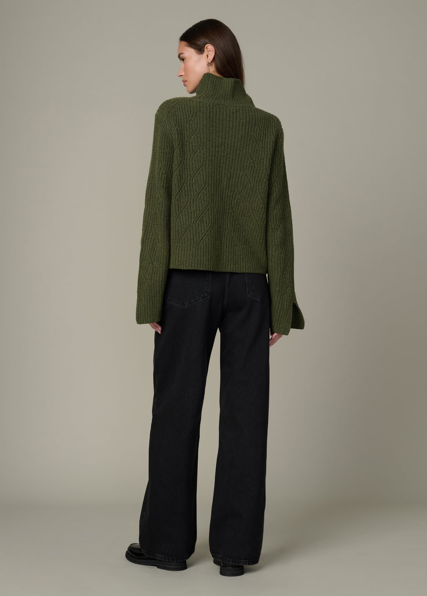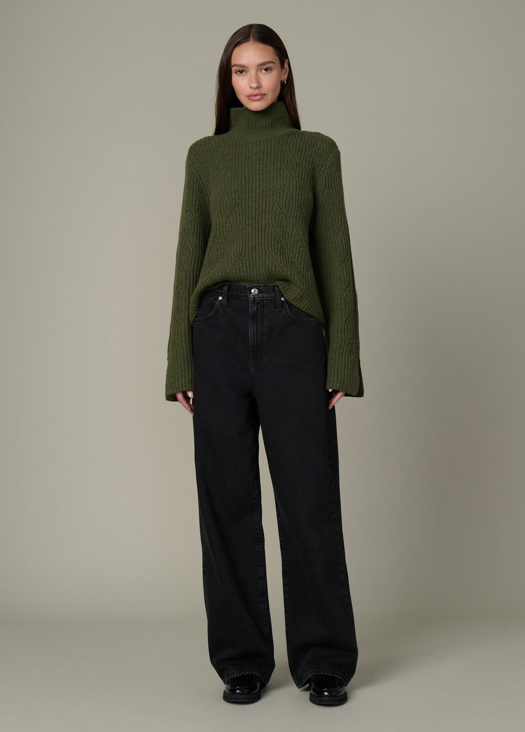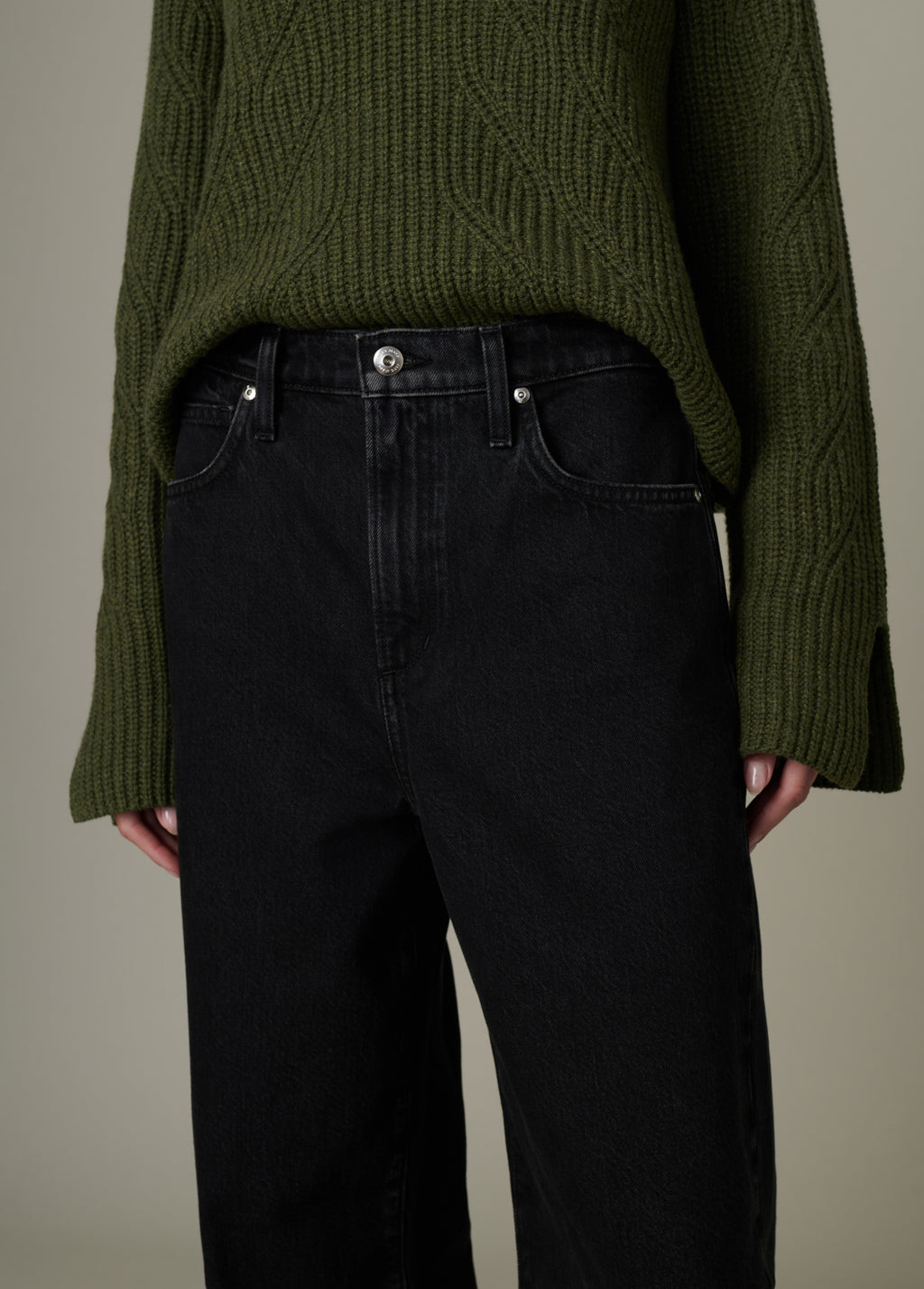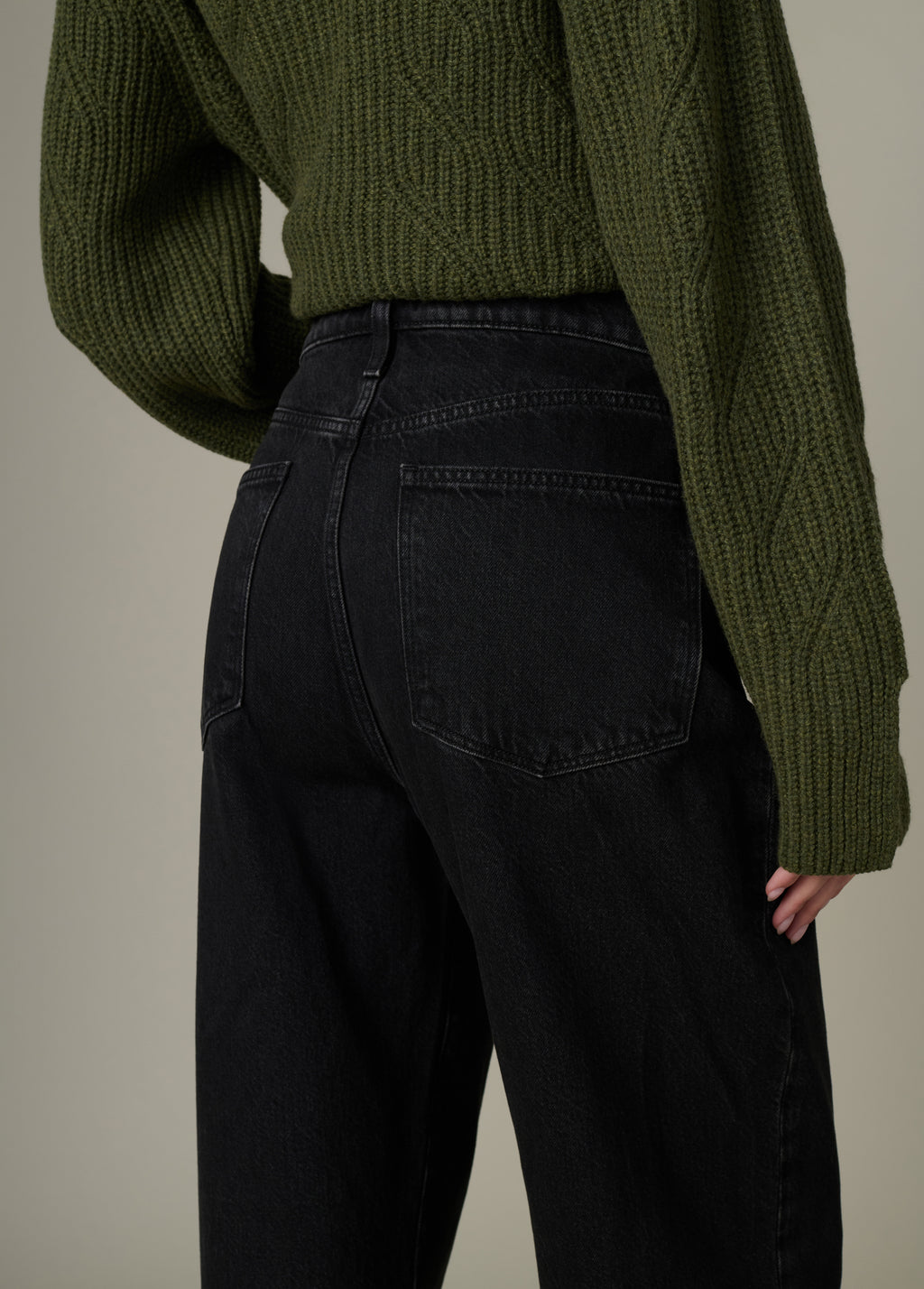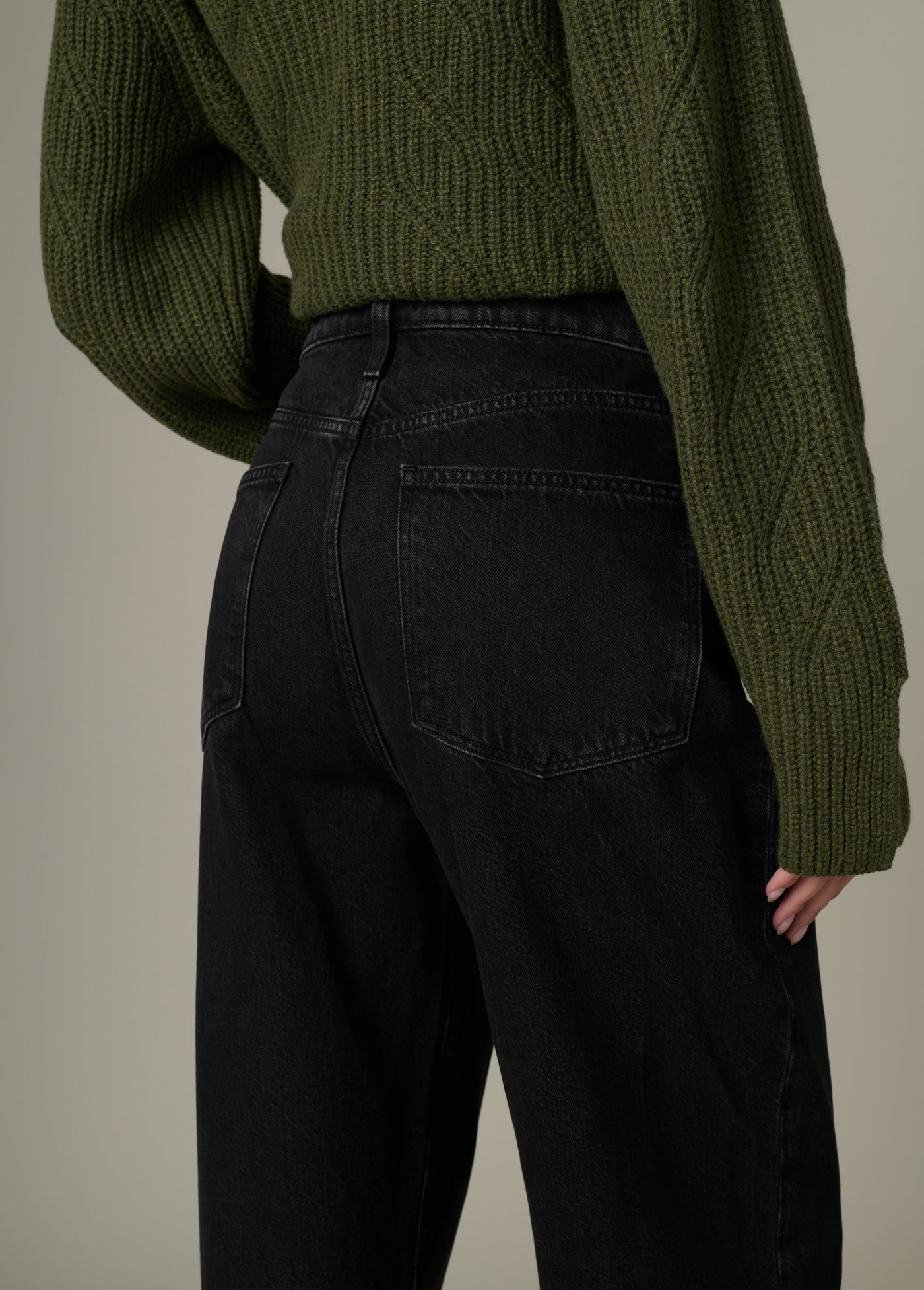 An oversized, relaxed fit that sits on the hip with a full-length inseam that pools over the foot.