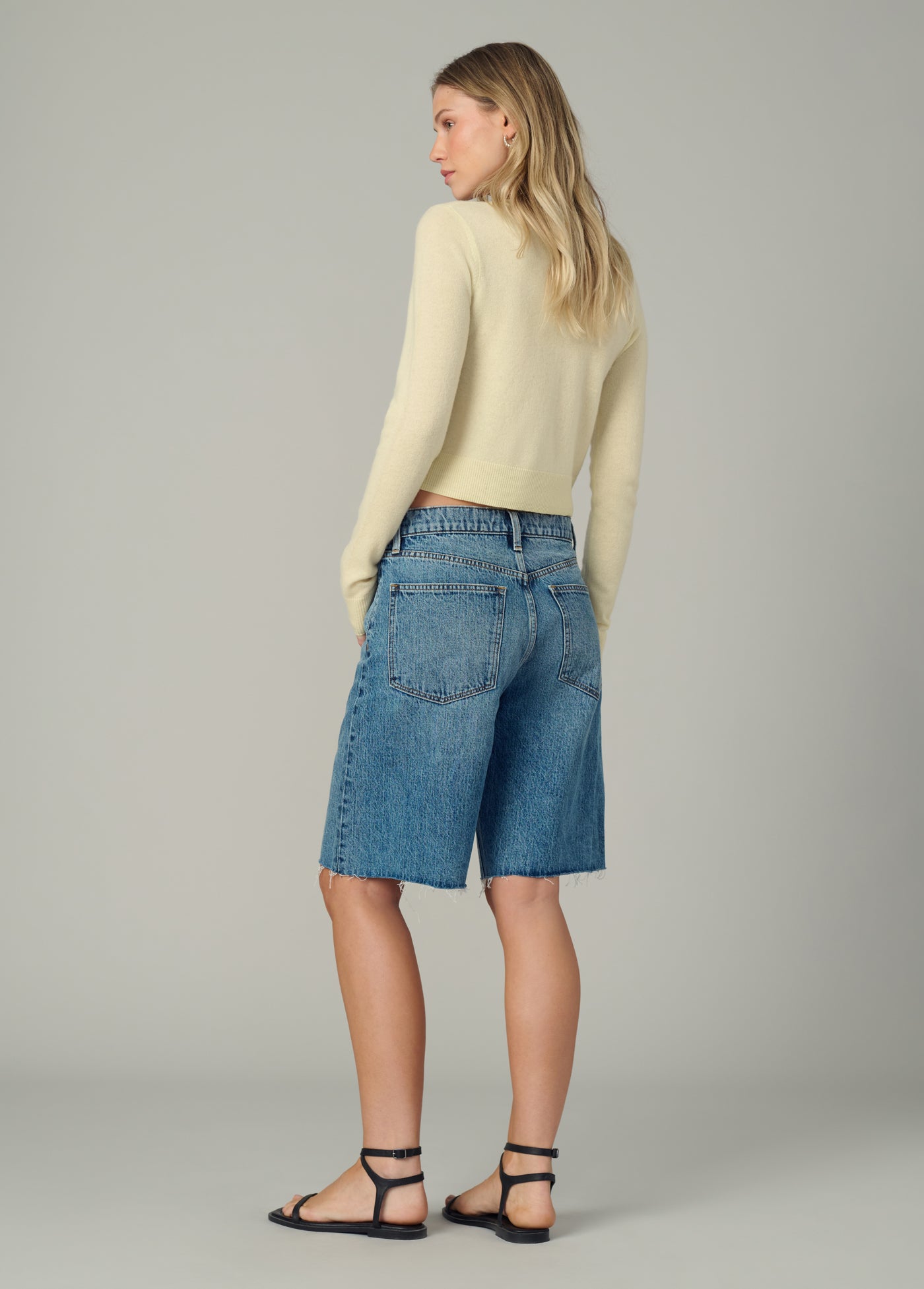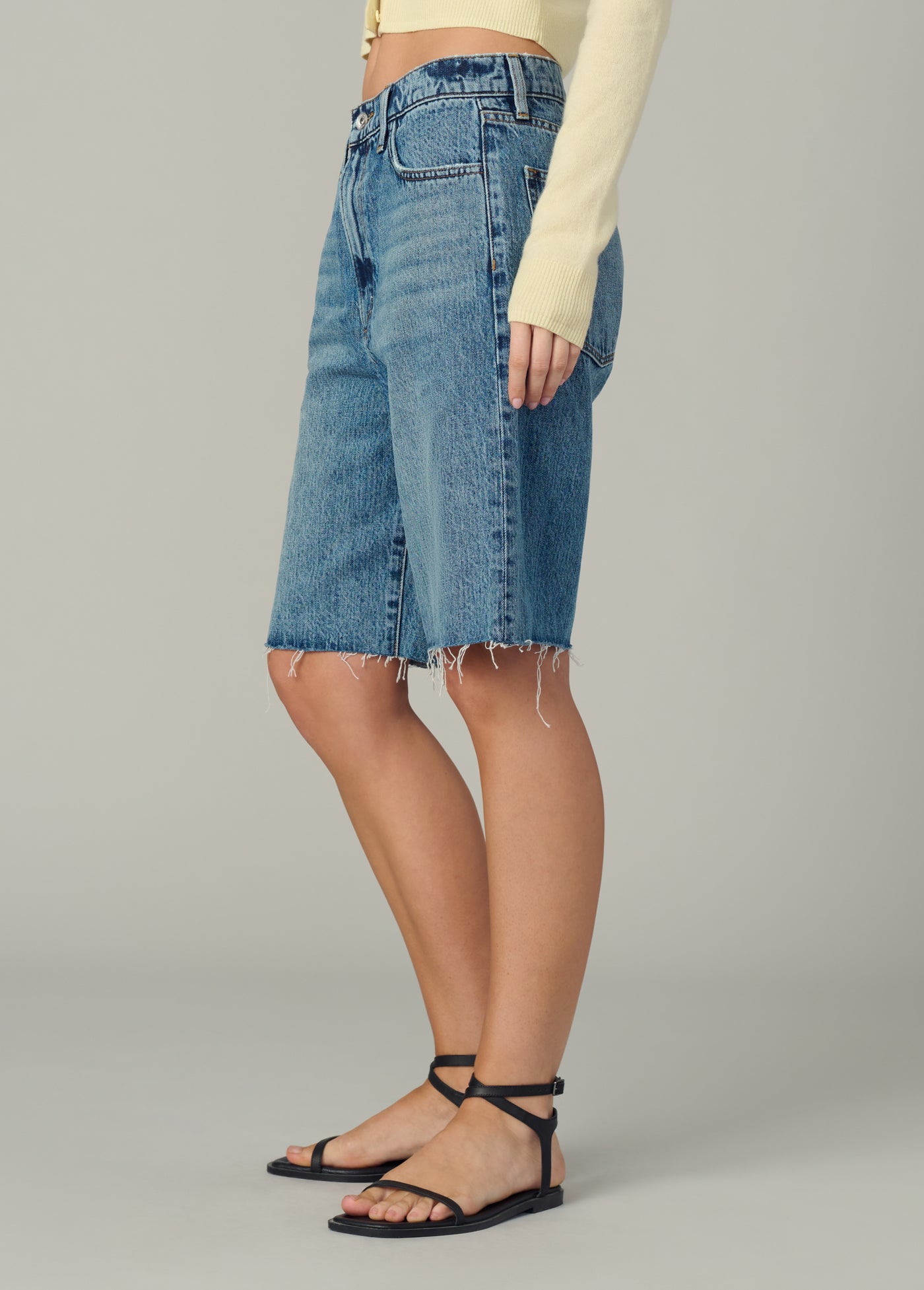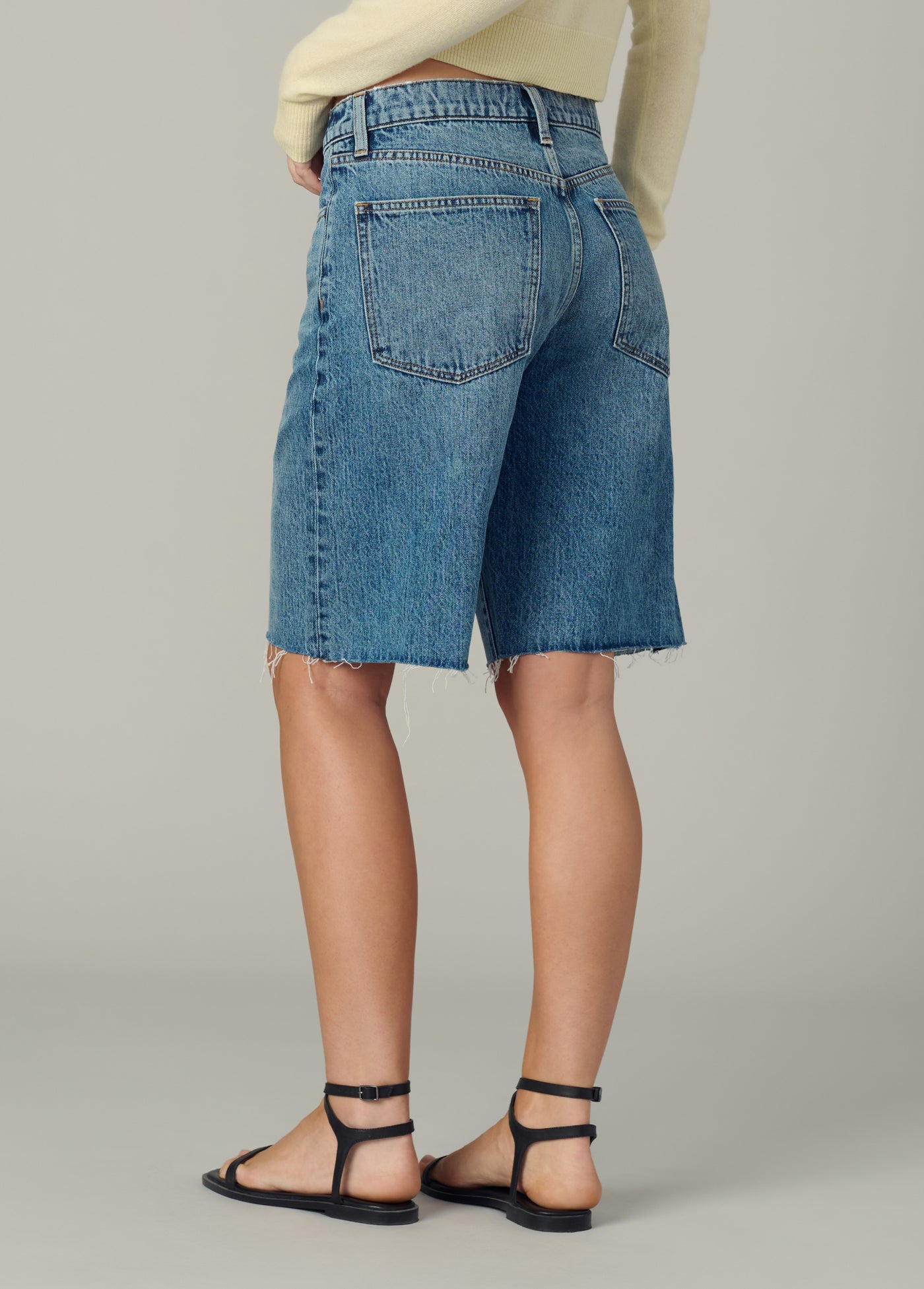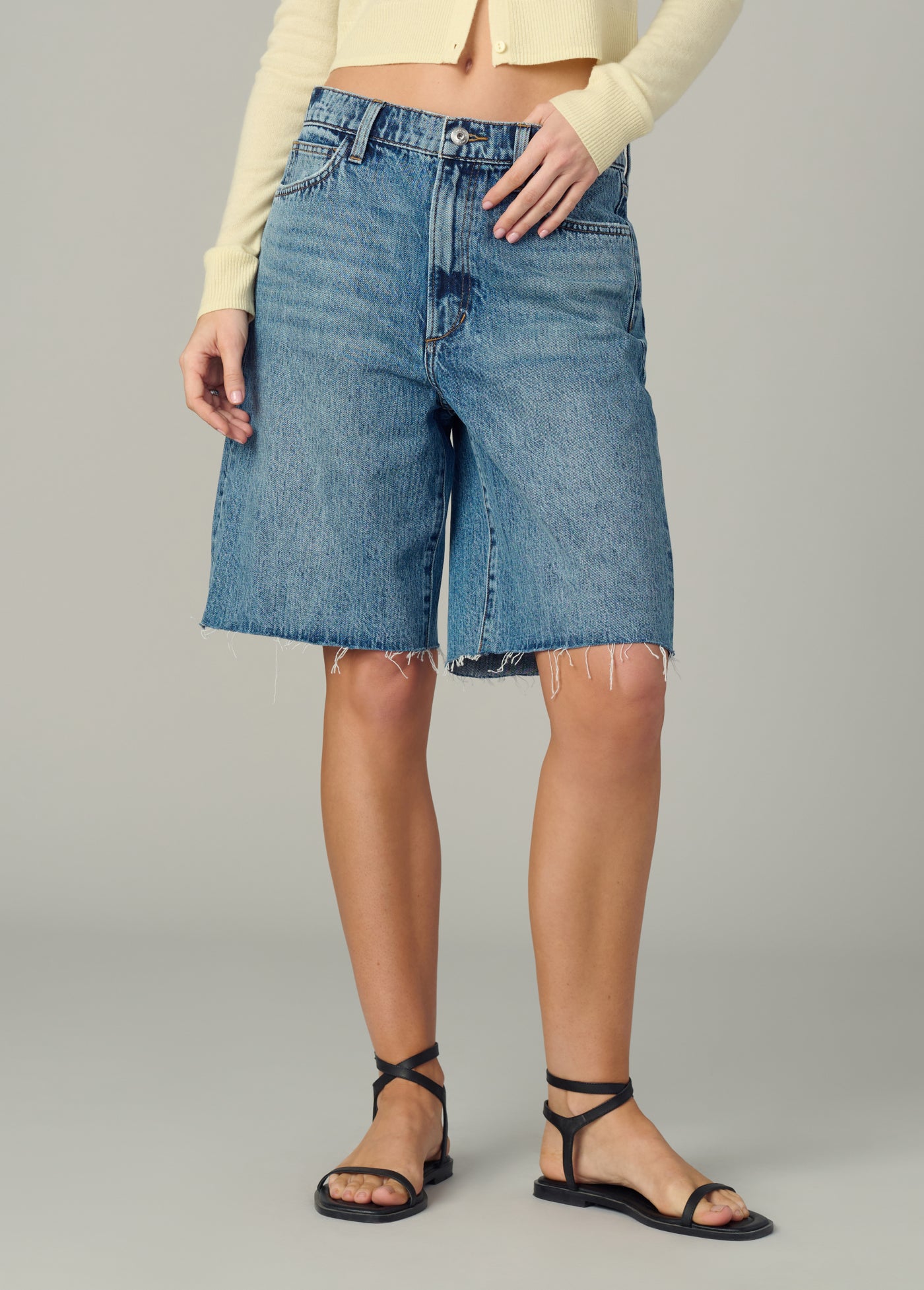 An oversized, relaxed short that sits low on the hip and falls to the bottom of the knee.