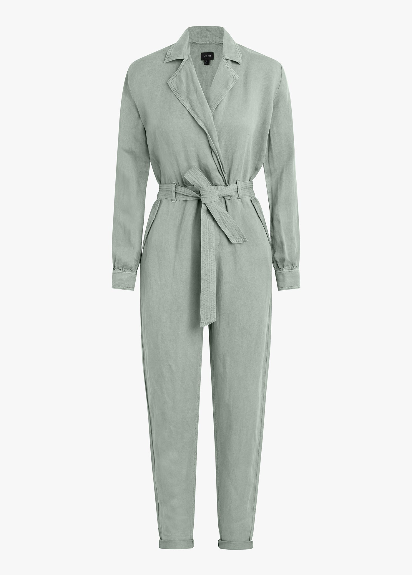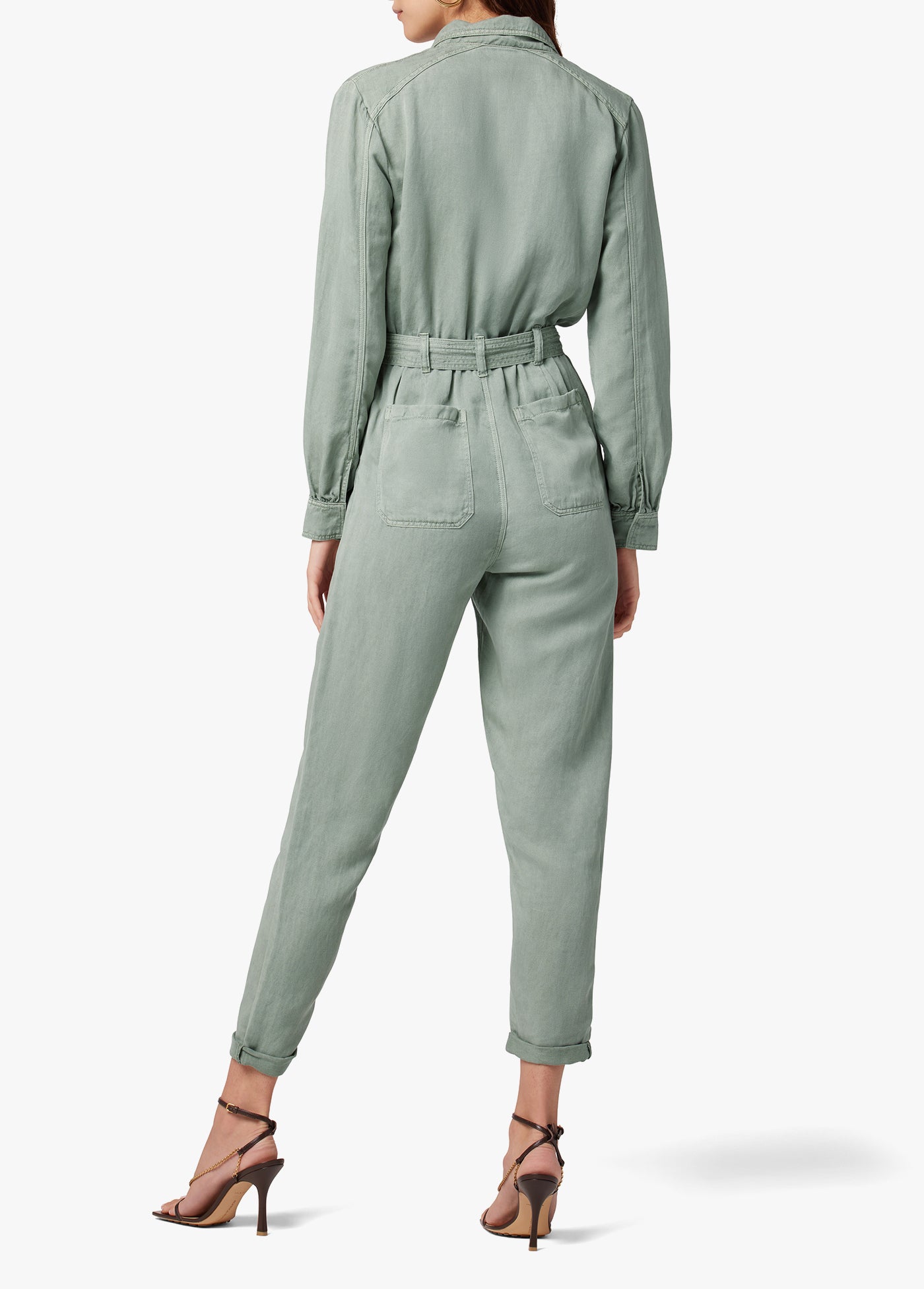 The Shirley Jumpsuit is an outfit all in one. Cut in a summer linen tencel in a dusty green seagrass, this one piece number has a belted waist and tapered leg for a flattering fit. The collared neckline adds a delicate touch to the workwear vibe on this summer must-have.
