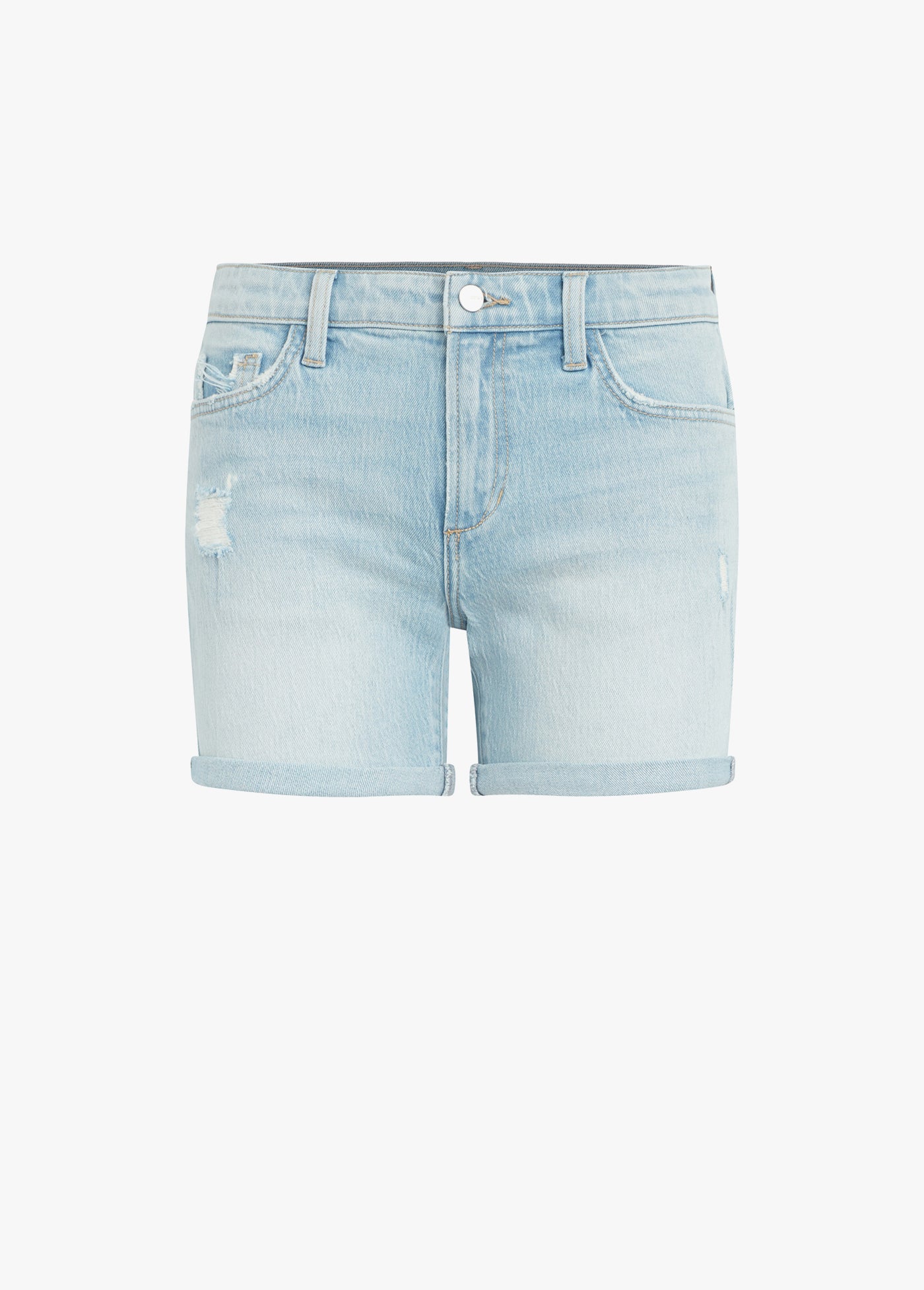 The 5” short in 'Stand Tall' is a mid-rise pair of cutoffs in a super washed out light blue with rolled hems. The five-pocket style has some destruction for a subtly worn-in look.