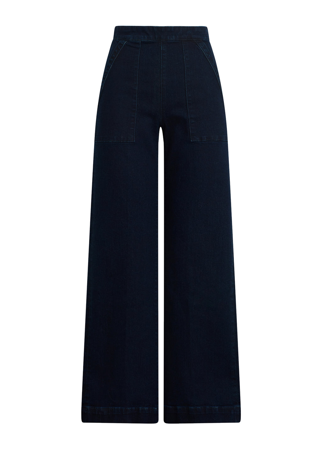 A wide leg fit with a high rise that is fitted at the waist and hips with a side zip entry, patch pockets and a full length.