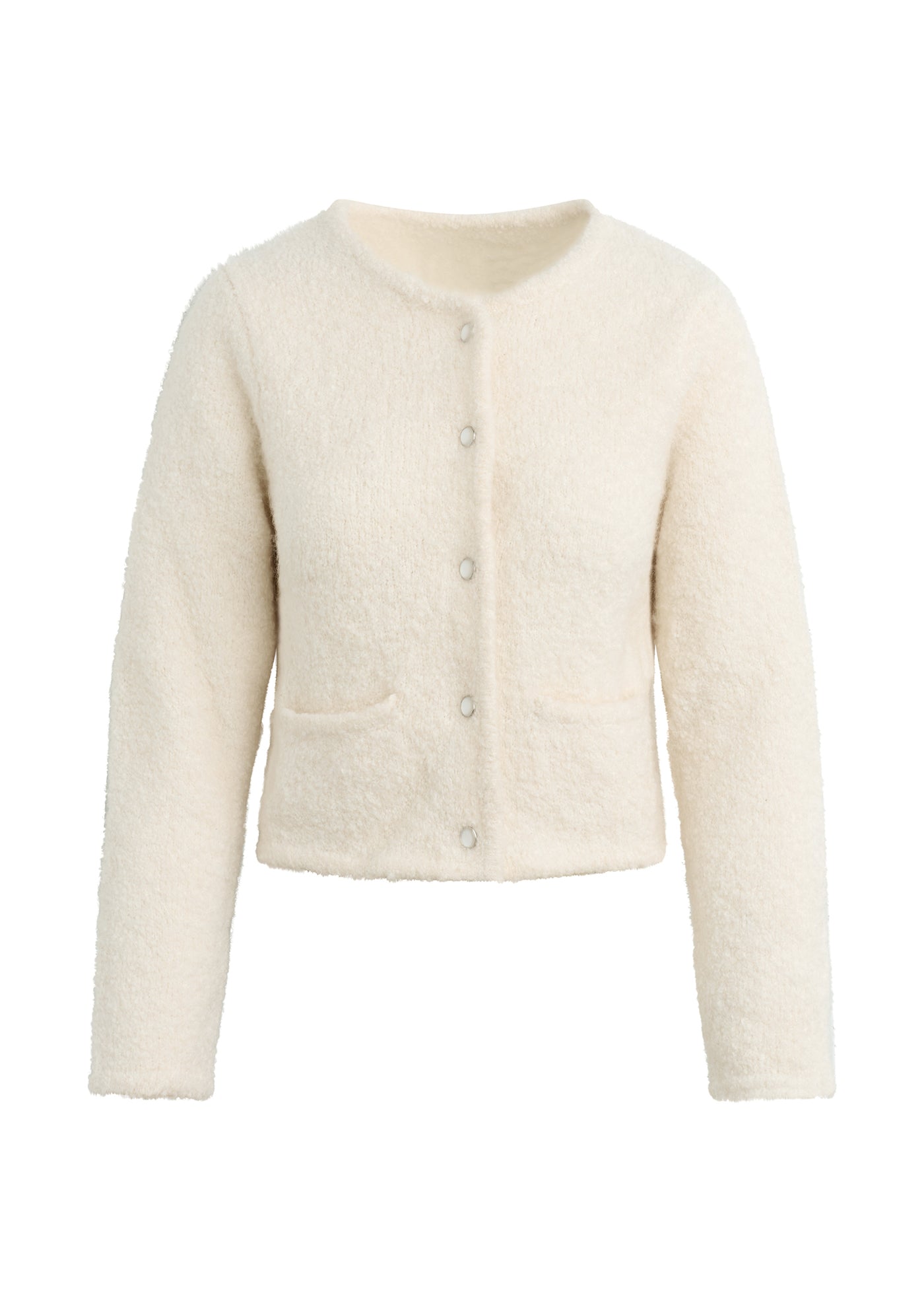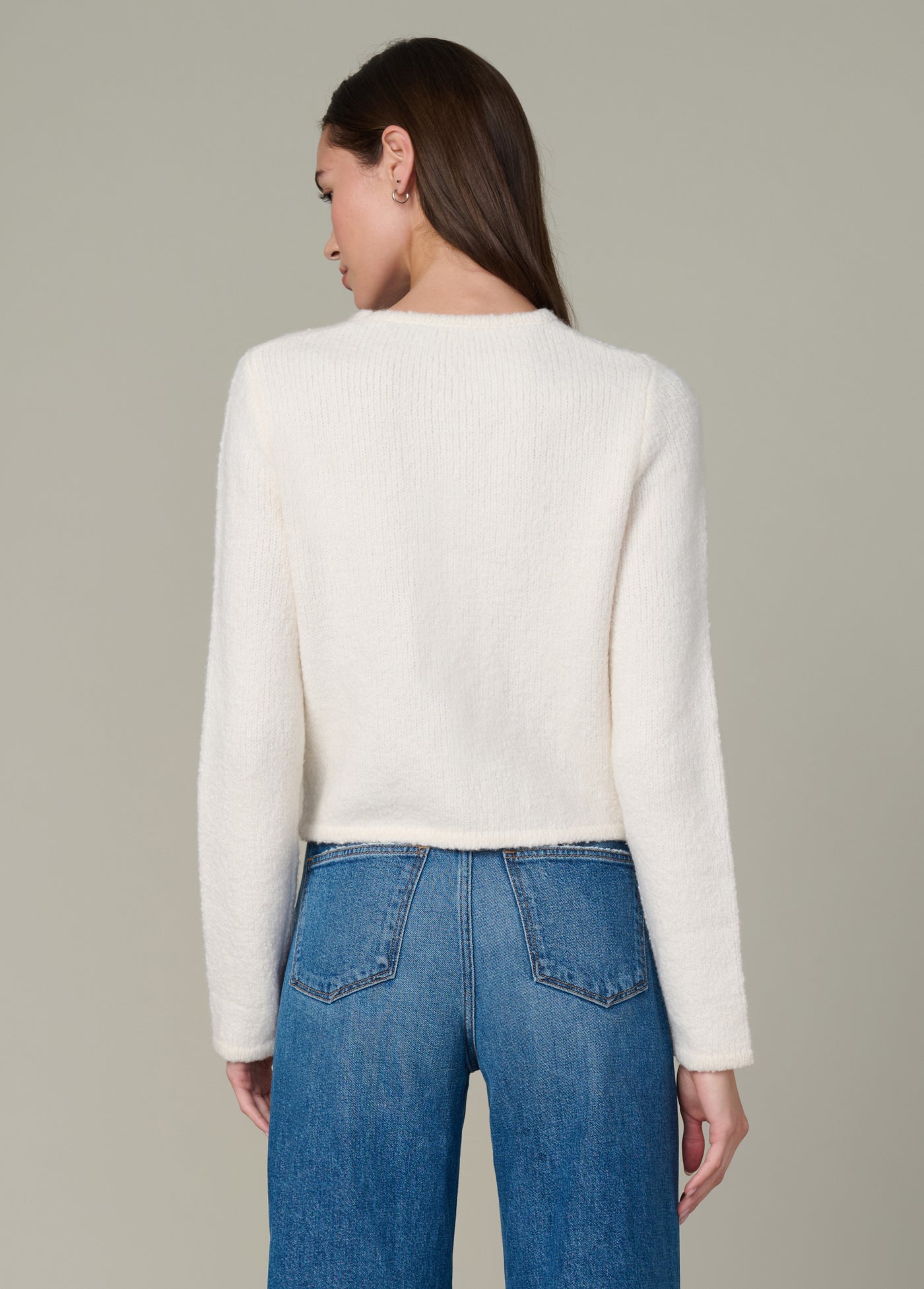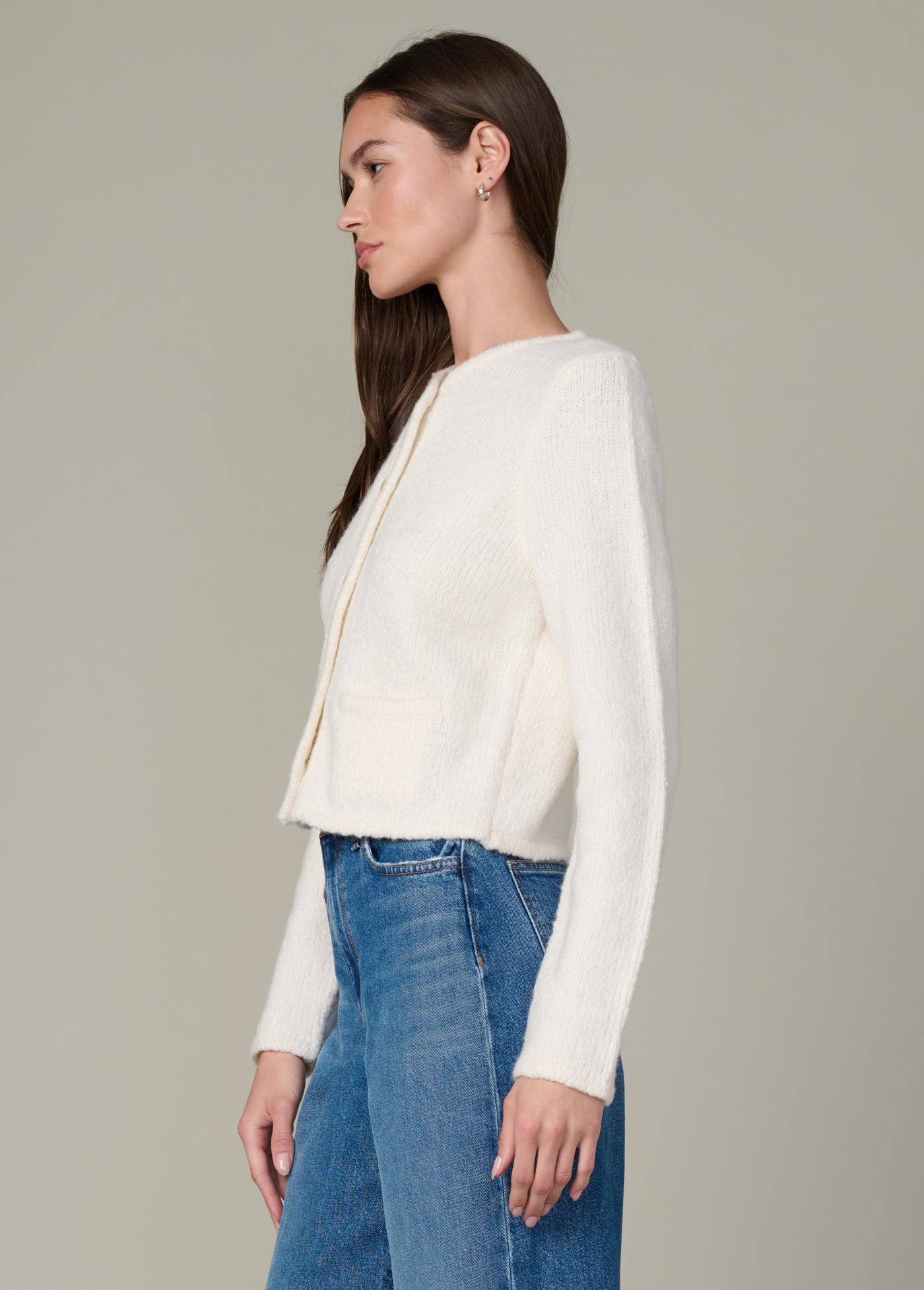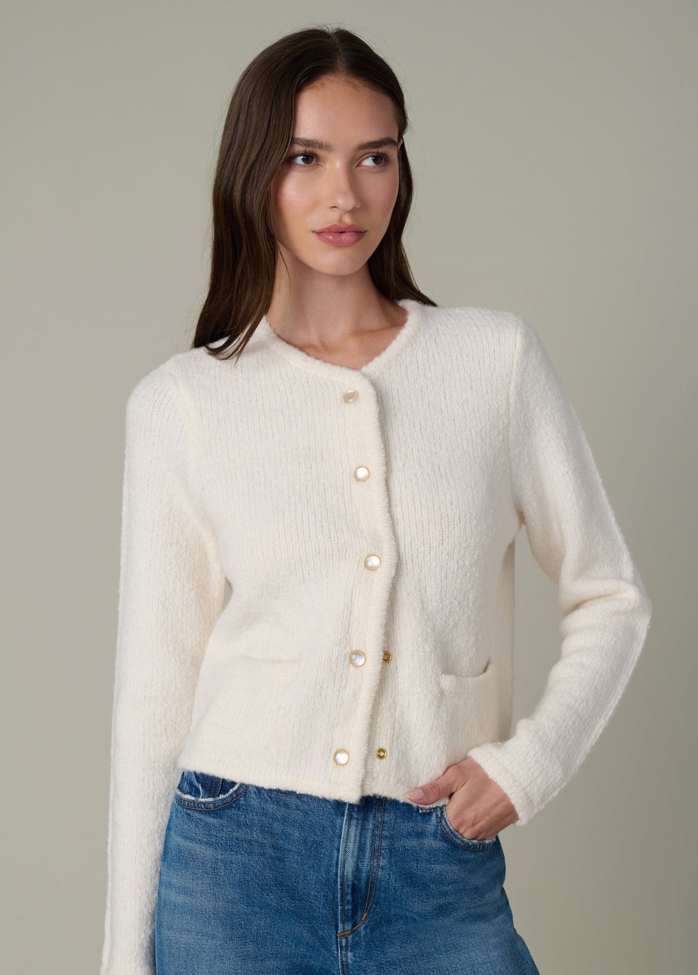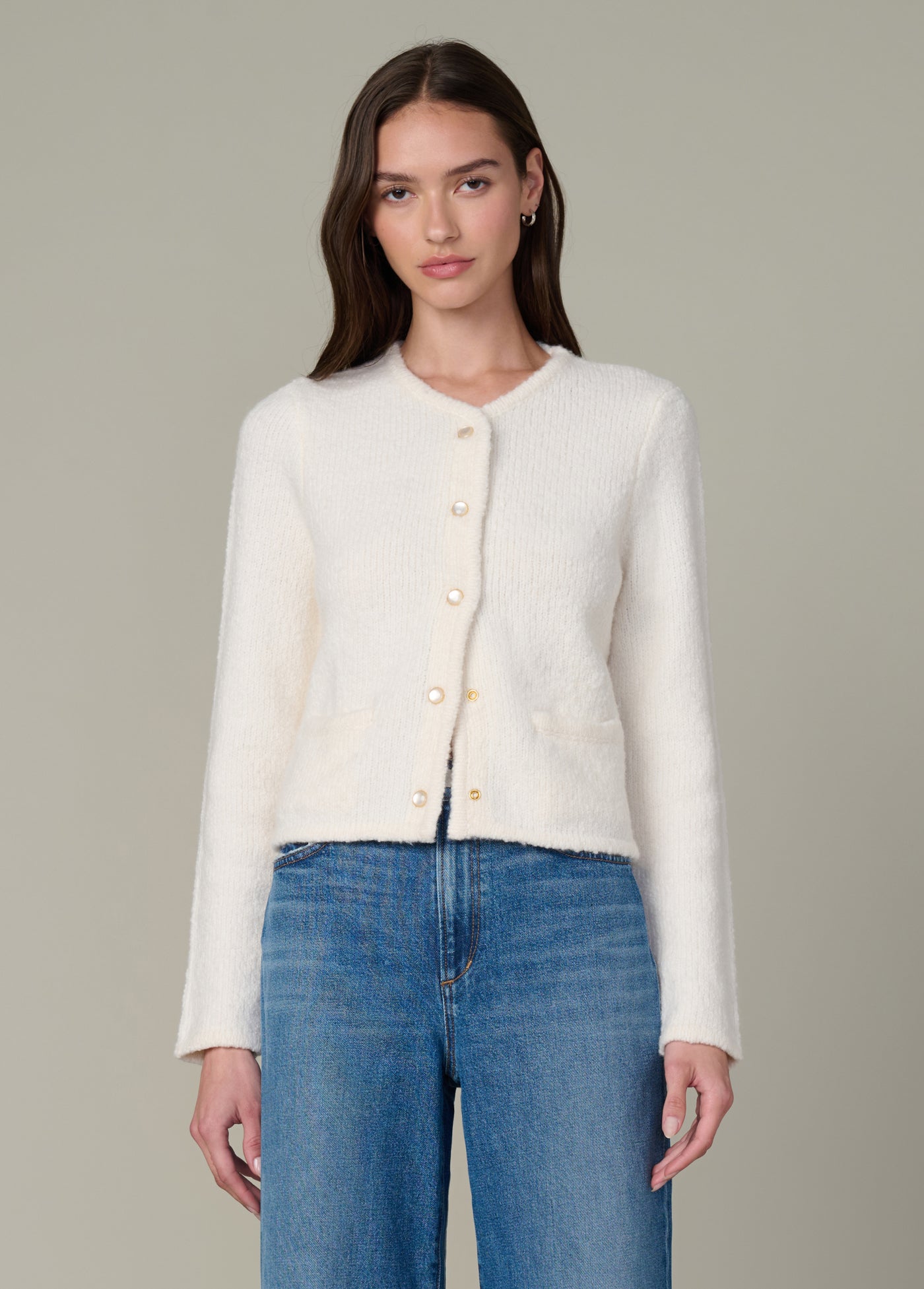An elevated, collarless cropped jacket in a tailored knit construction with the perfect accent buttons.