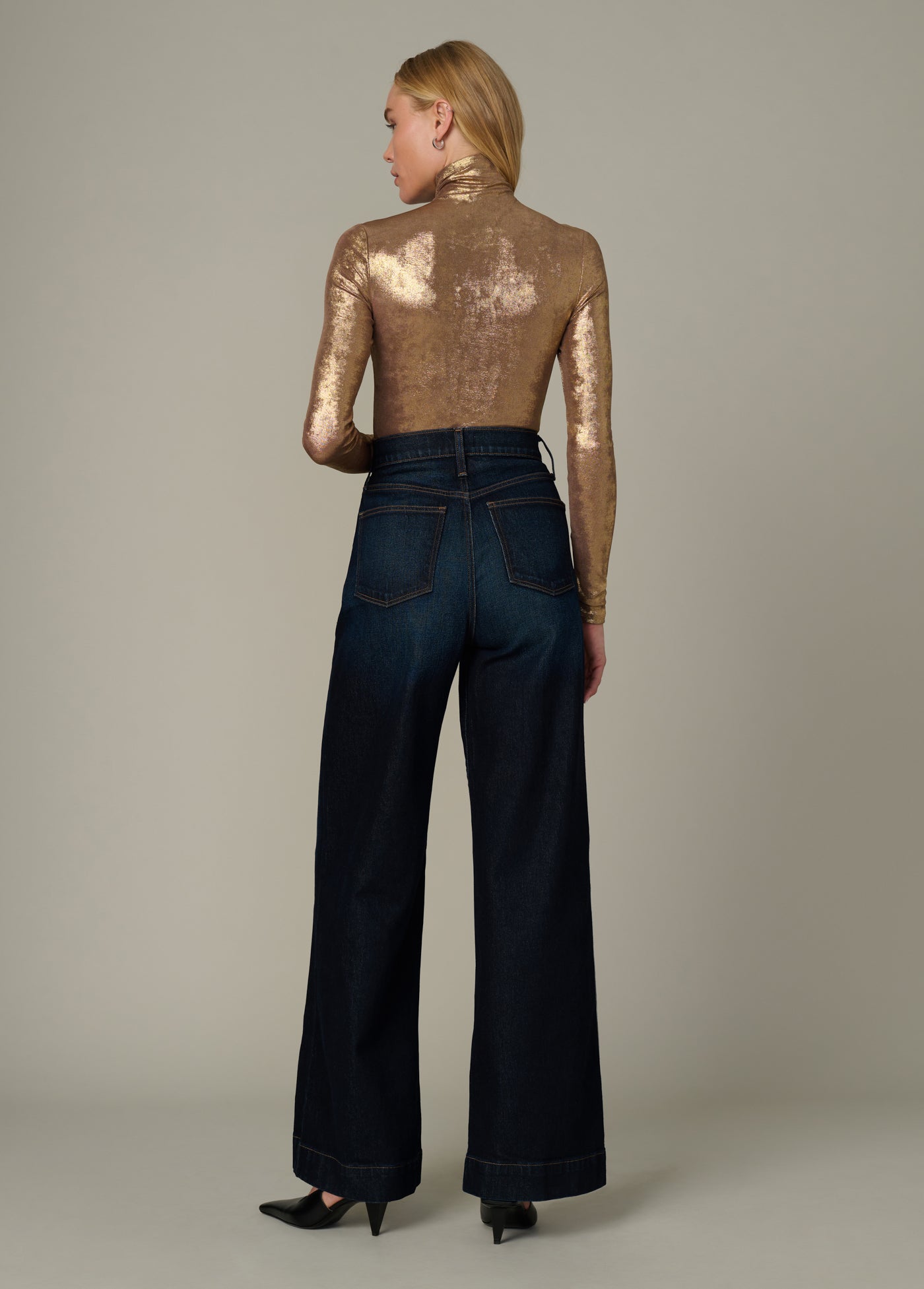 Polyester-spandex blend with a luxe metallic finish.