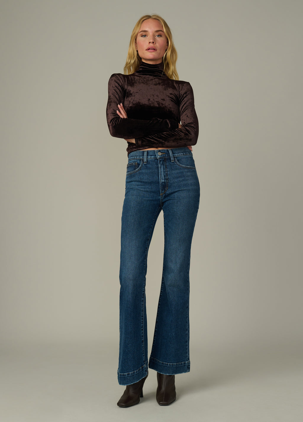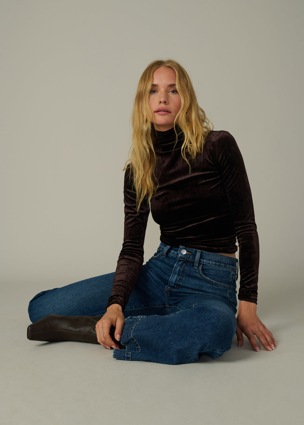 A long-sleeved funnel neck top in a fitted silhouette--the perfect layer, now in a rich crushed velvet knit.