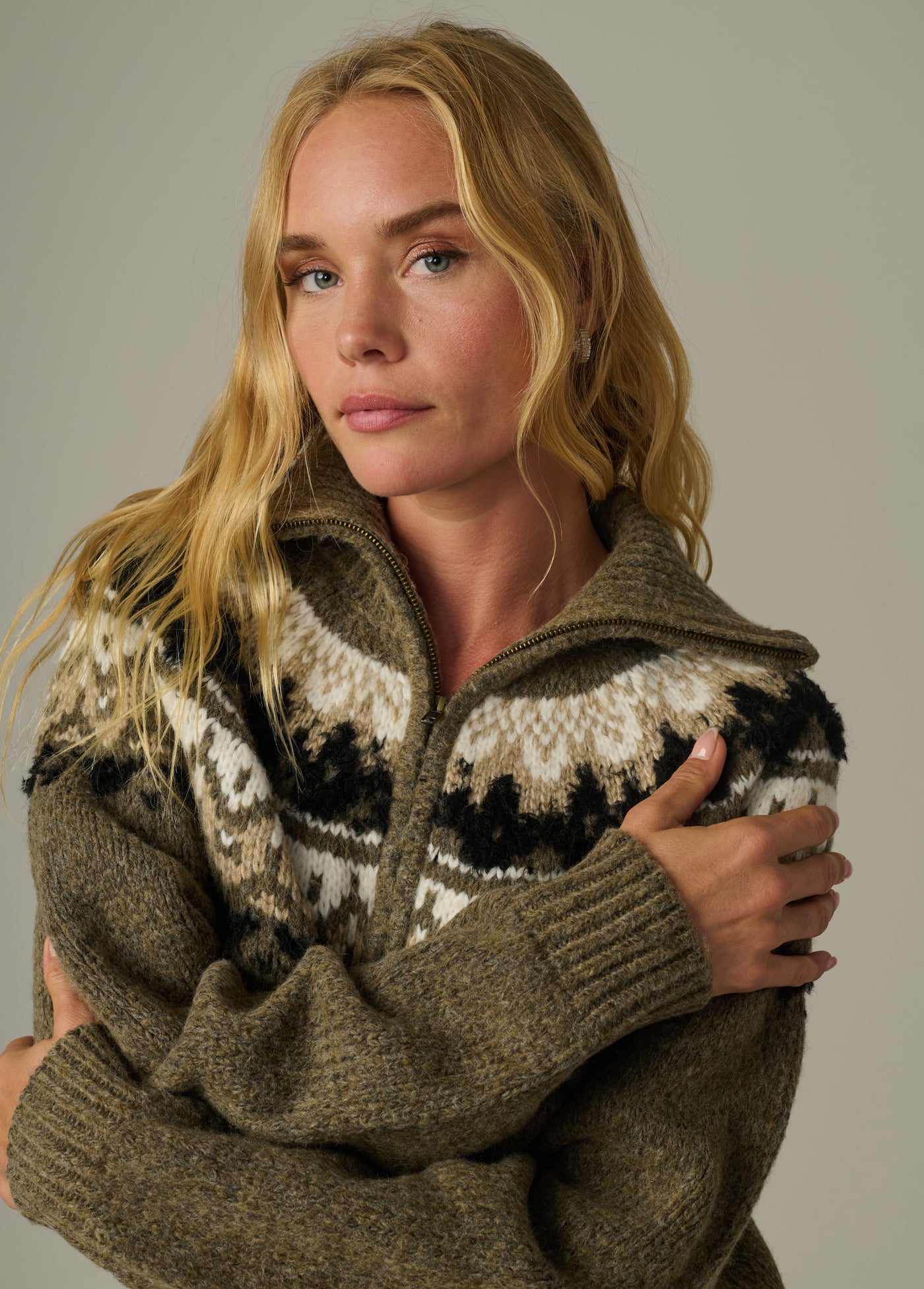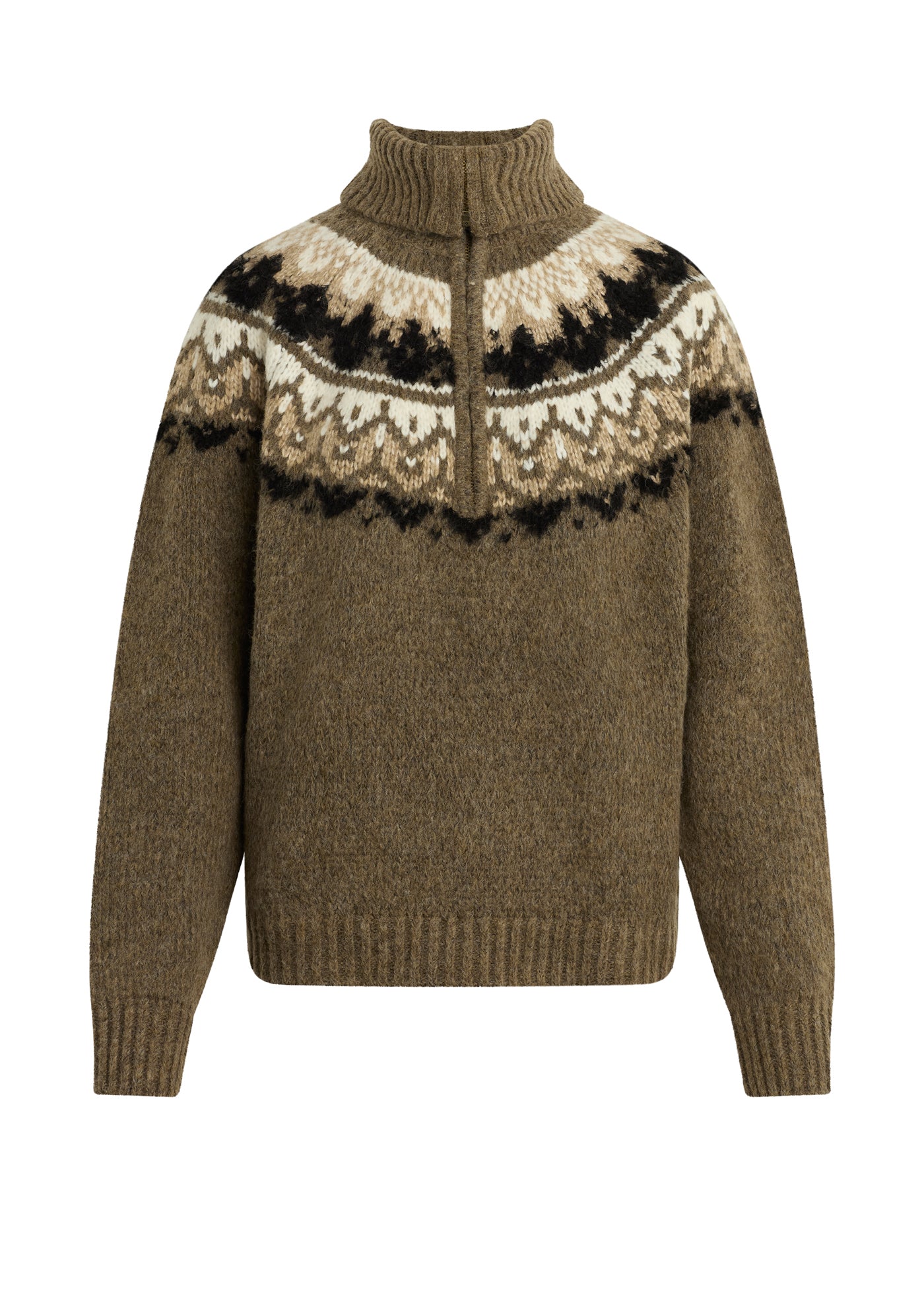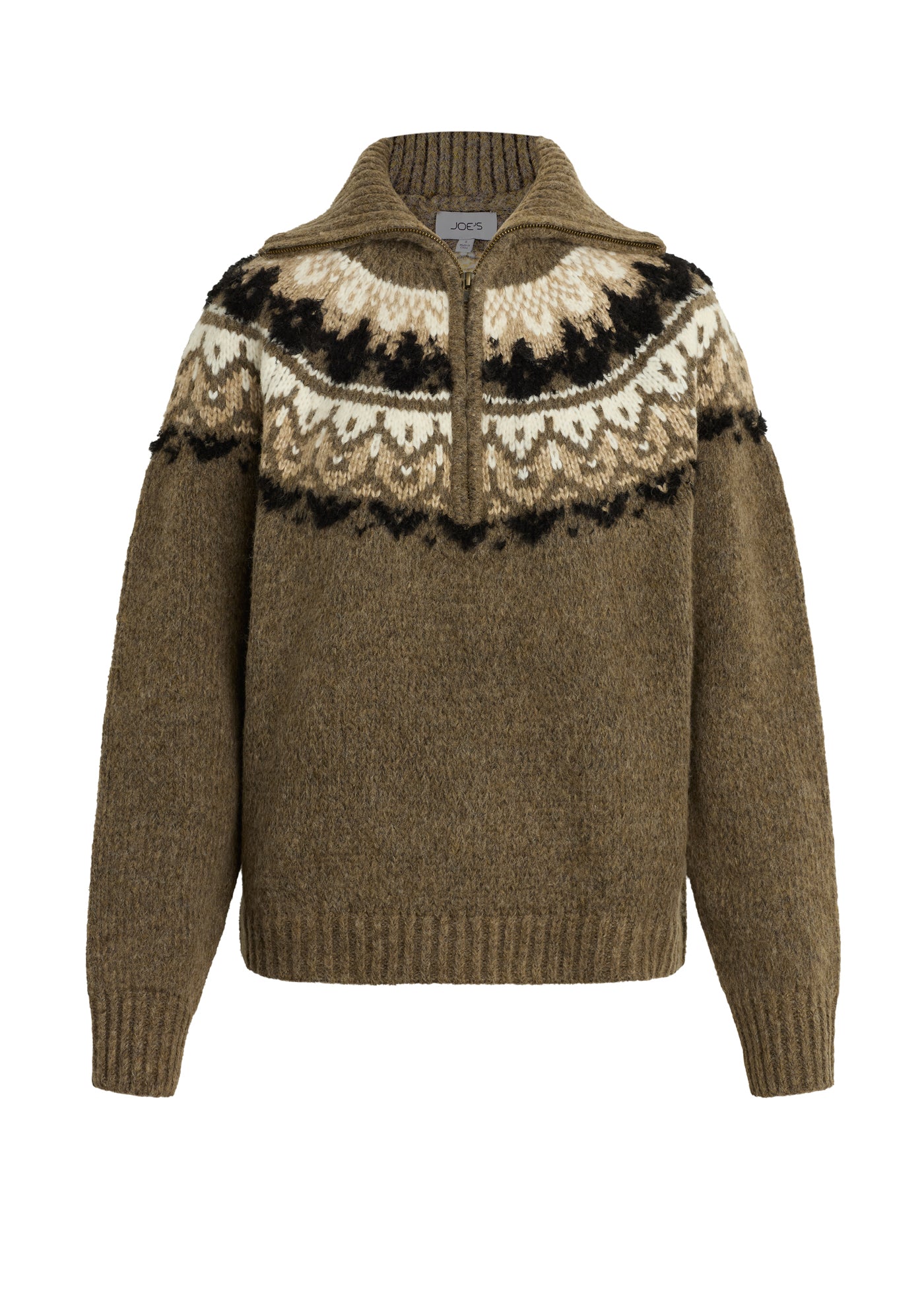 A traditional Fair Isle pattern refreshed in a chic half-zip, oversized sweater.