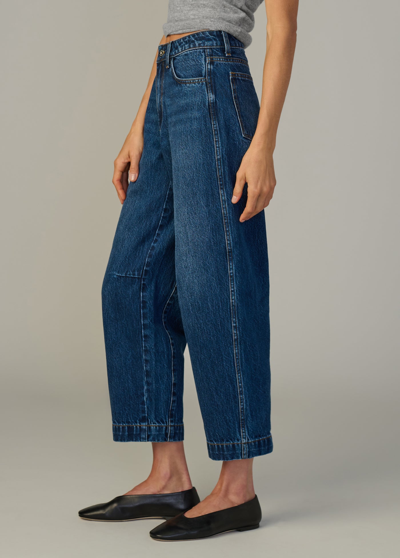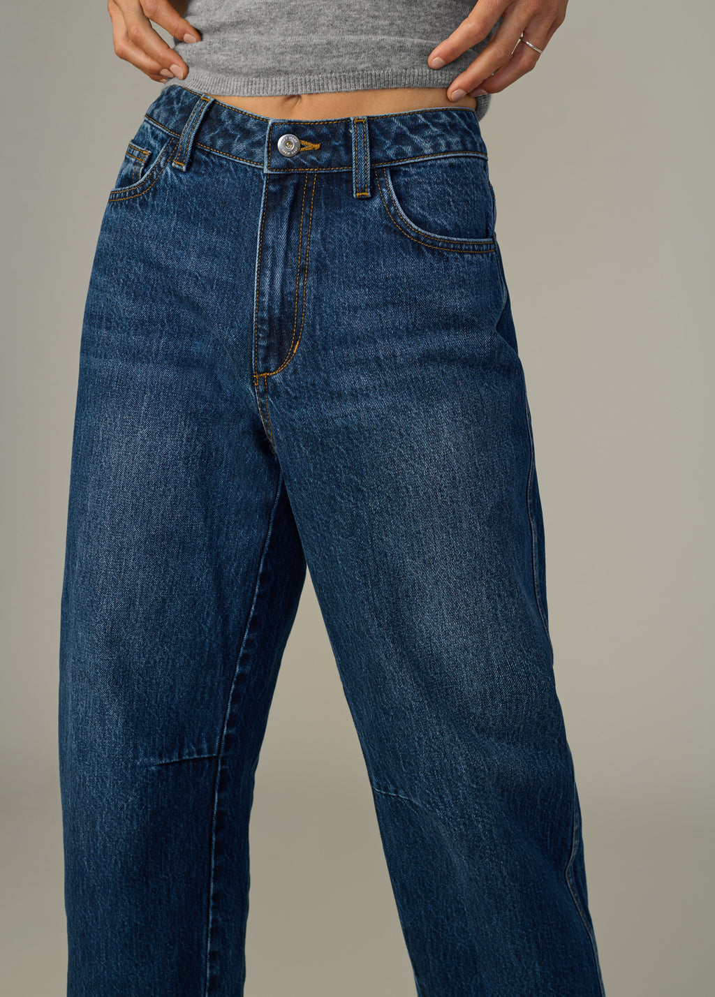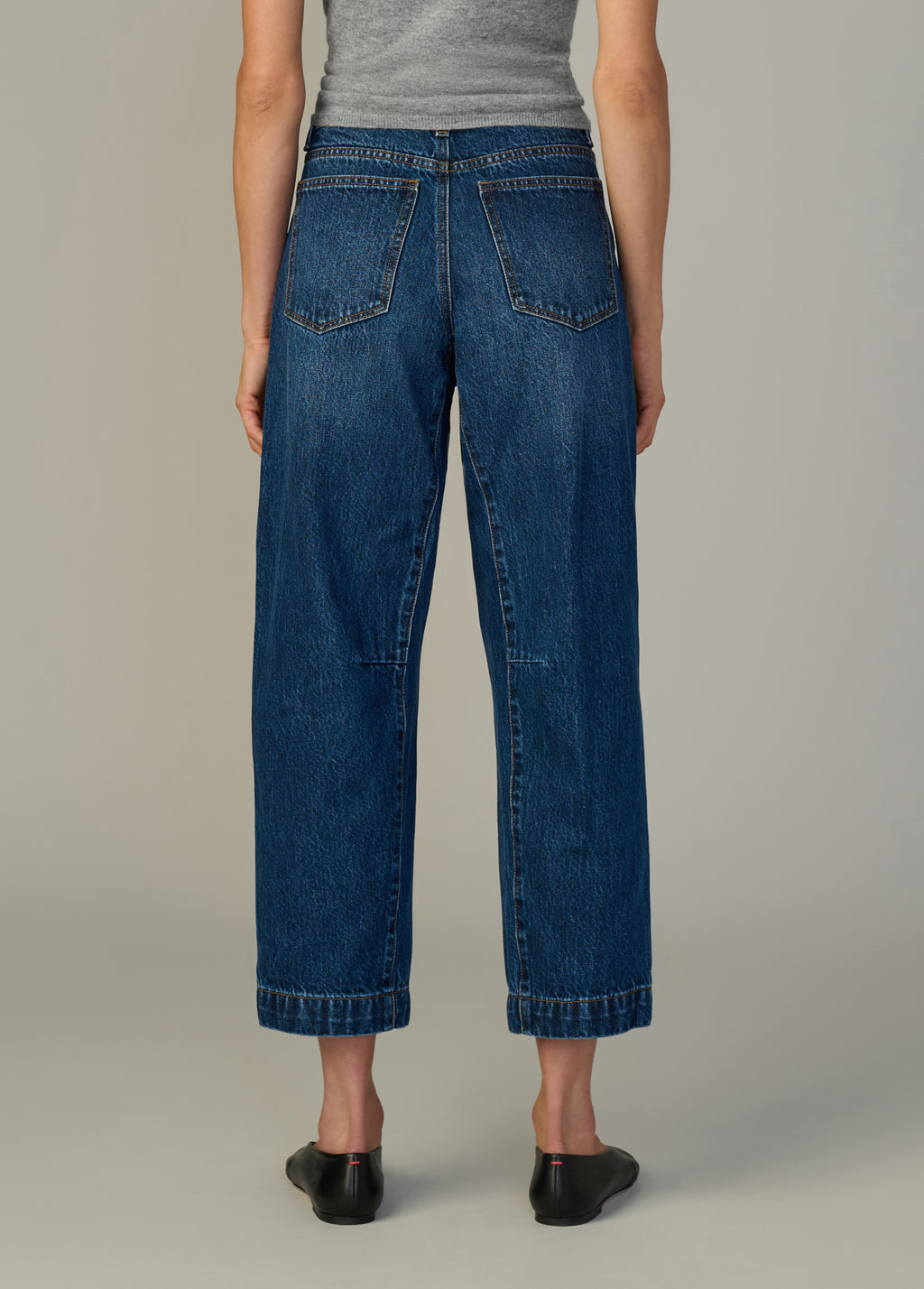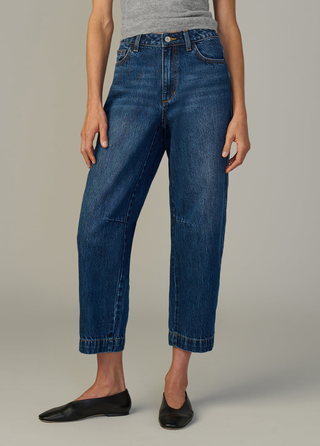 A relaxed rise and an easy fit through the waist and hip with an inseam gusset and barrel-shaped leg that hits at the ankle.