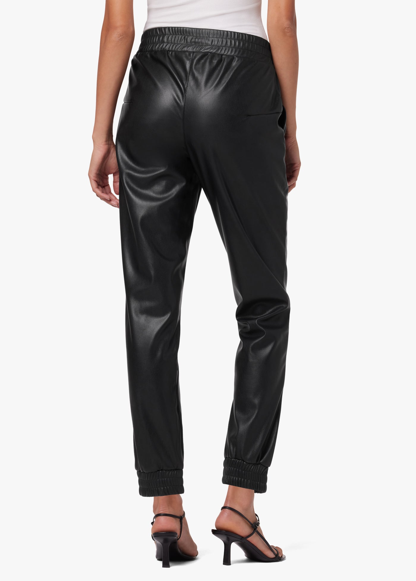 The tapered leg and pull on waistband make these joggers comfortable. The black vegan leather make them noticeable. Style with heels for a night out or pair with sneakers for an afternoon lunch.