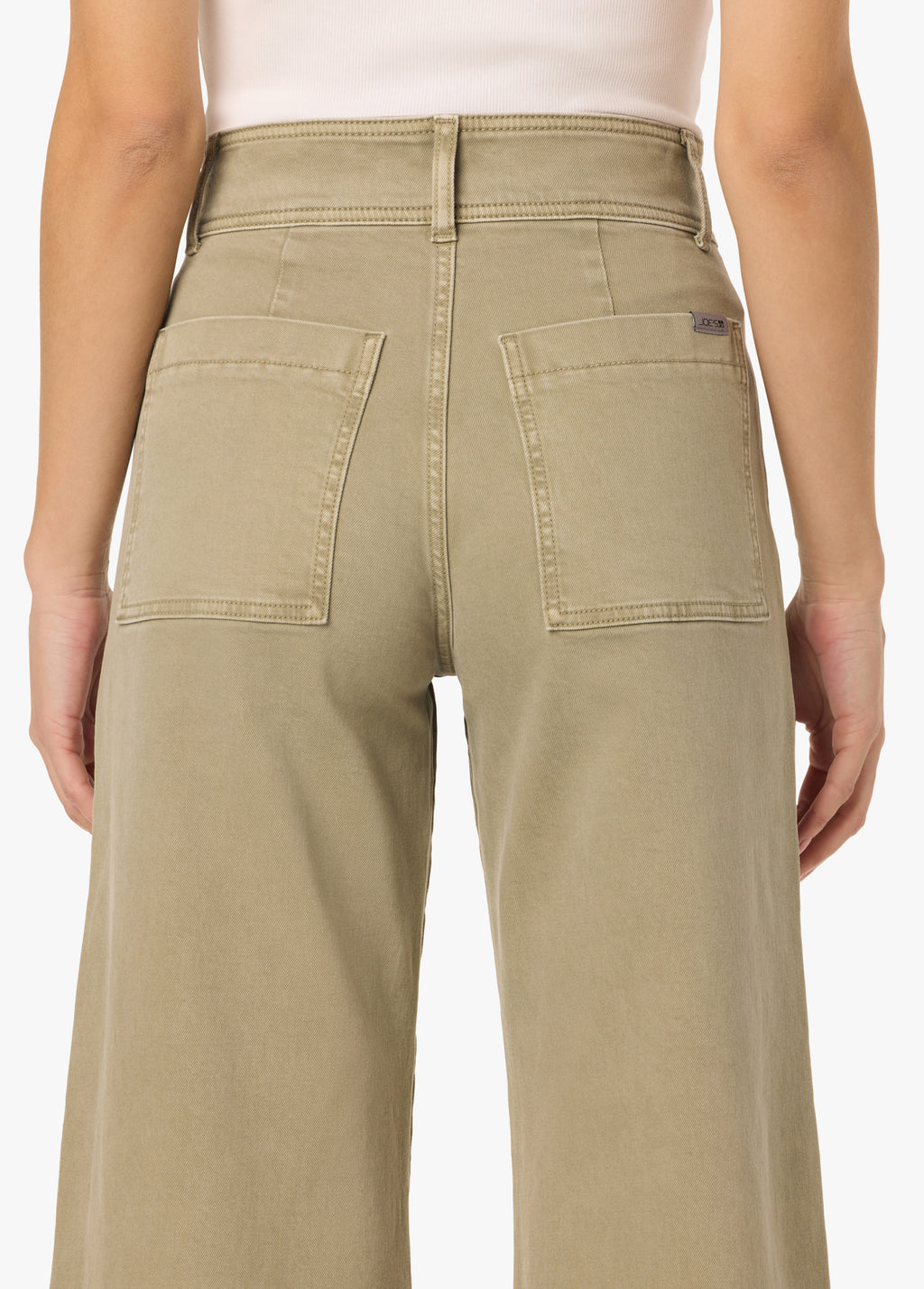 A slim fit through the waist and hip with a 28" ankle-length and cargo styling, wide leg in tan Elm wash.