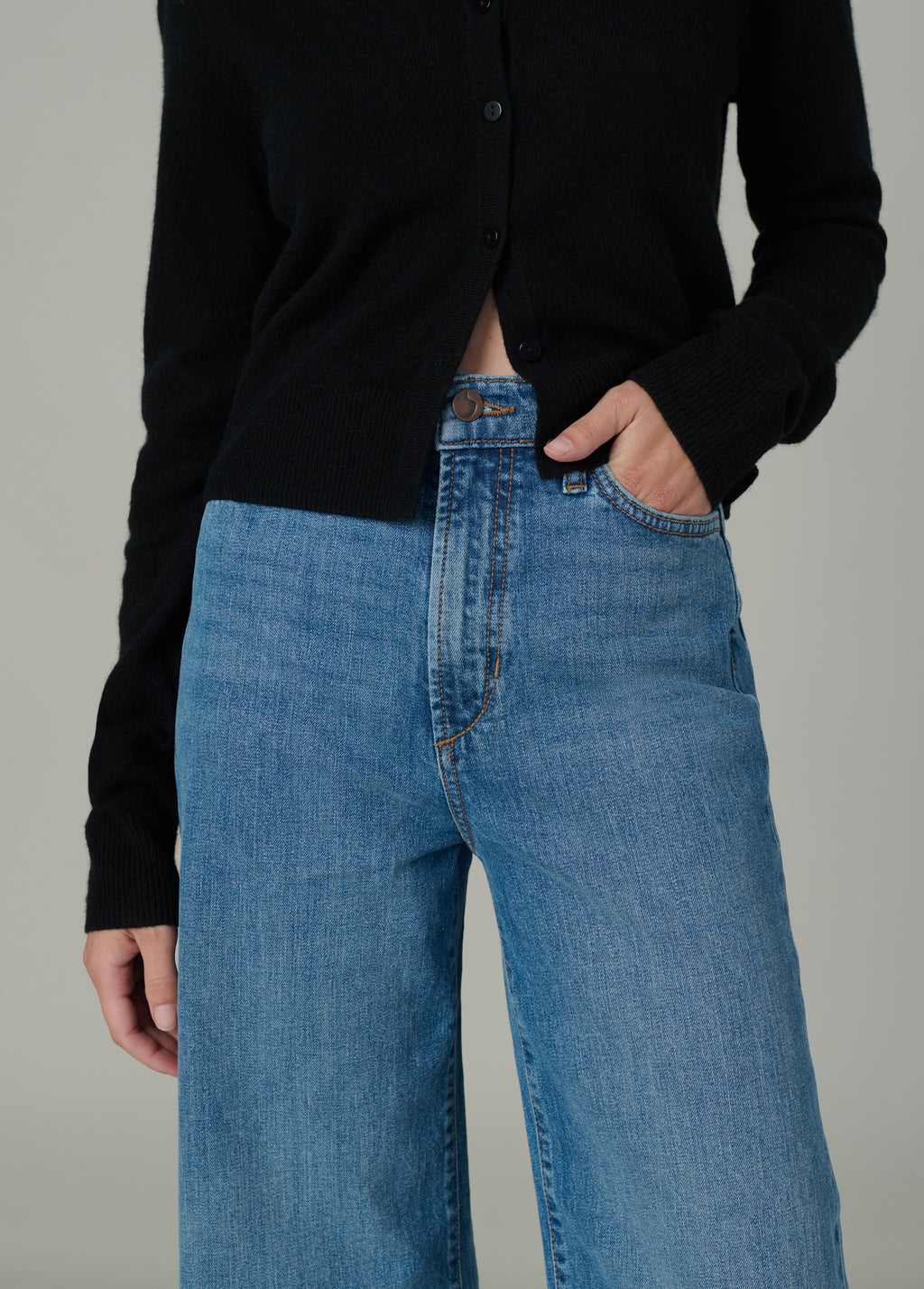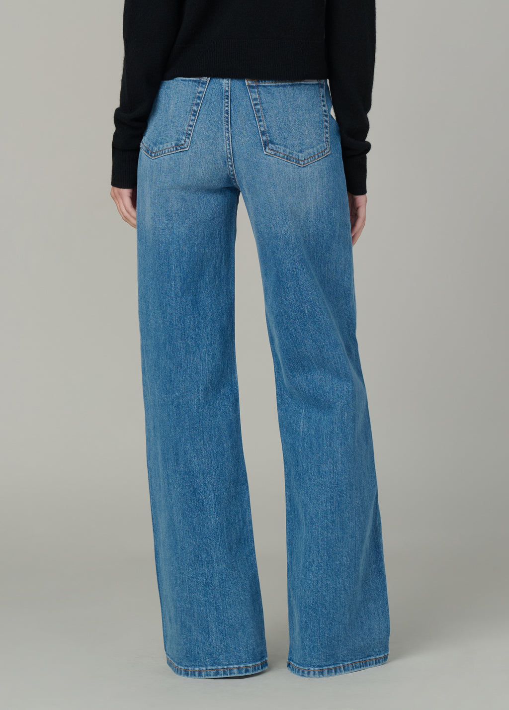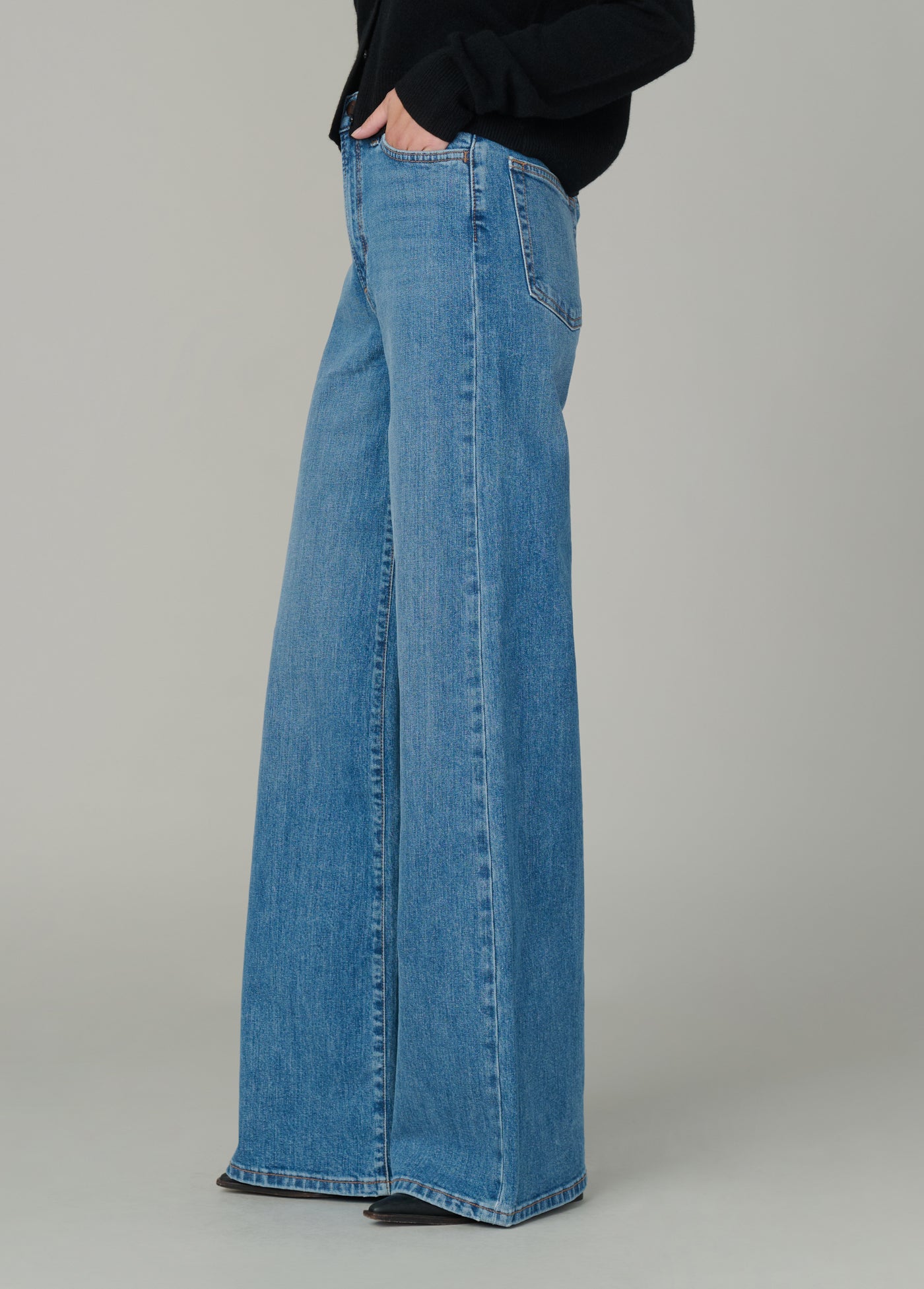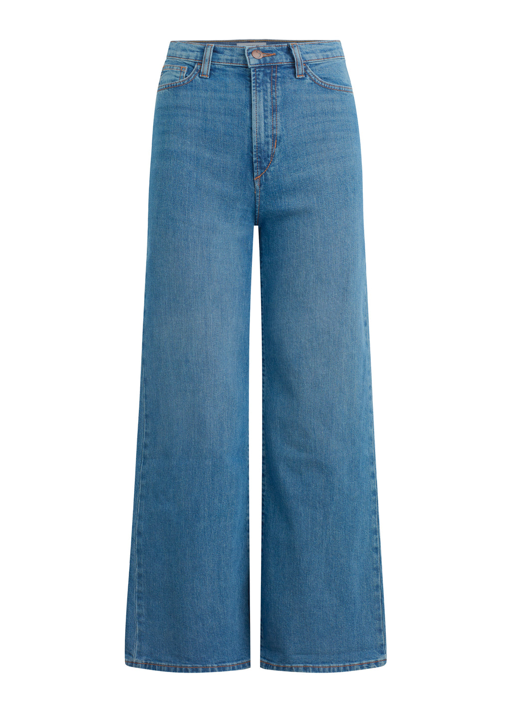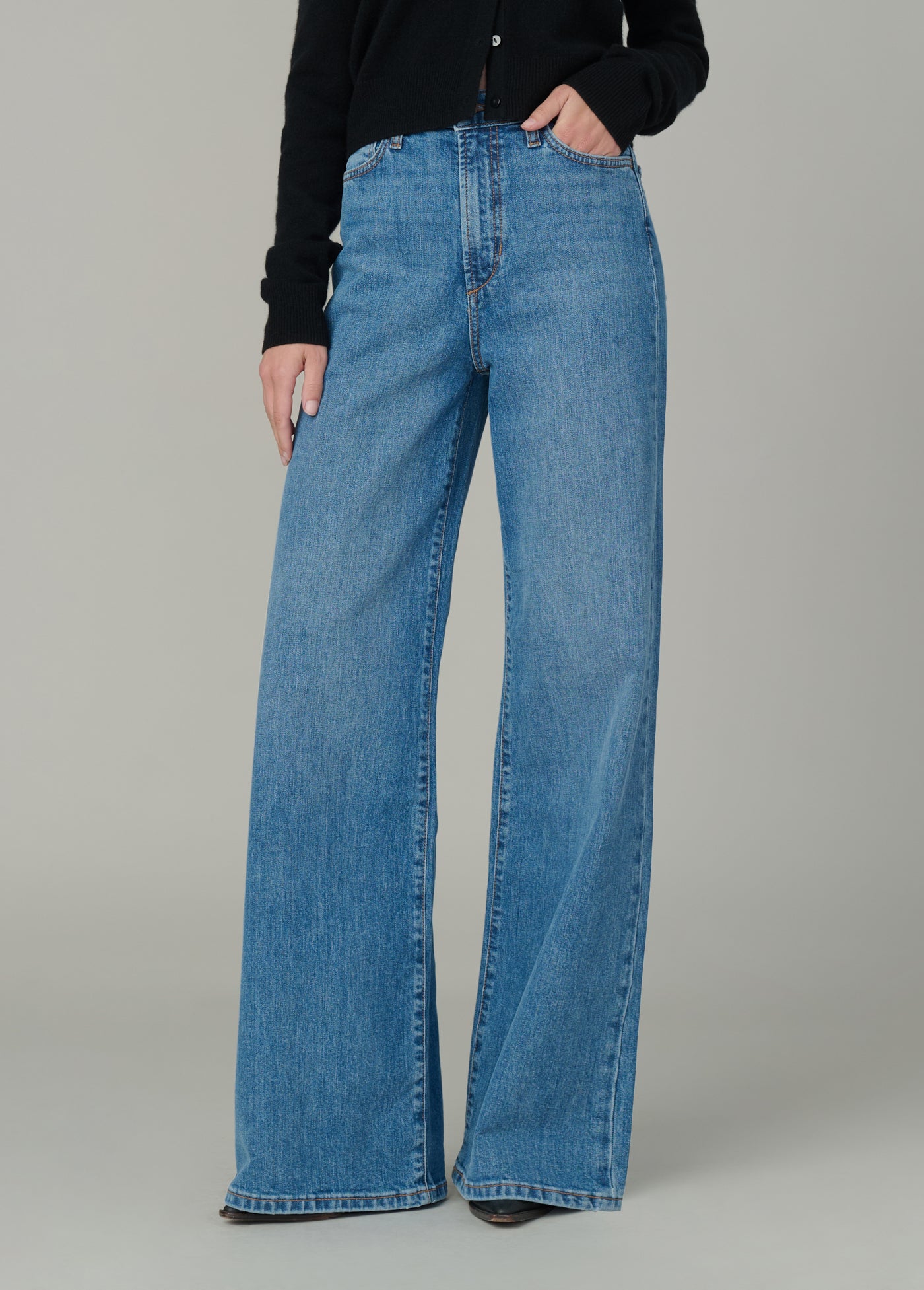 A high rise and slim fit through the waist and hip with a full-length wide leg.